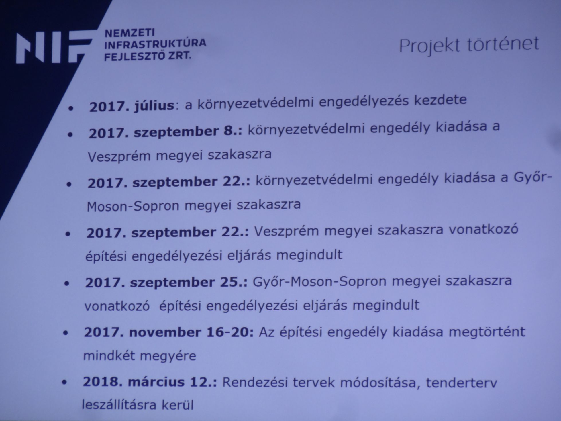 Mint ismeretes, az új út alapkőletételére a tavalyi évben sor került, mivel az M1-es autópályánál egy rövid szakasz és egy új csomópont építése már megkezdődött. Dr. Kovács Zoltán országgyűlési képviselőtől megtudtuk, a további 36 kilométeres szakasz előkészítése javában zajlik, folynak a földhivatali és az építésügyi hatóság általi záradékolások a különböző területfelhasználási engedélyekkel kapcsolatosan – mondta Kovács Zoltán hozzátéve, bízik abban, hogy hamarosan a munkagépek is elkezdhetnek dolgozni, ehhez az kell, hogy minél hamarabb eredményesek legyenek a közbeszerzési eljárások. Előreláthatólag 2019 tavaszán veheti kezdetét a látványos építkezés és 2022-re készülhet el az új út.