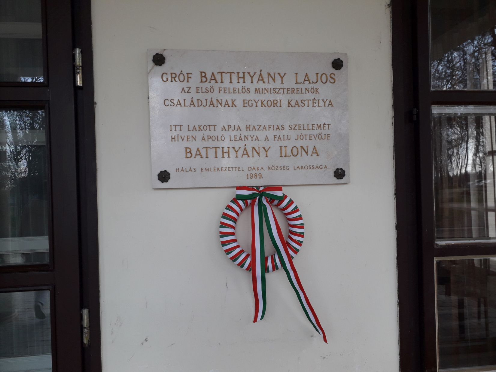 Harminc esztendeje pedig annak, hogy a nemrégiben elhunyt dr. Tóth Dezső könyvtáros, lokálpatrióta vezette Szülőföld Baráti Kör kezdeményezésére márványtábla hirdeti a család Pápa melletti emlékezetét hajdani kastélyukon, a várostól alig nyolc kilométerre fekvő Dáka községben, a következő fölirattal: „Gróf BATTHYÁNY LAJOS az első felelős miniszterelnök családjának egykori kastélya. Itt lakott apja hazafias szellemét híven ápoló leánya, a falu jótevője BATTHYÁNY ILONA. Hálás emlékezettel Dáka község lakossága 1989.”