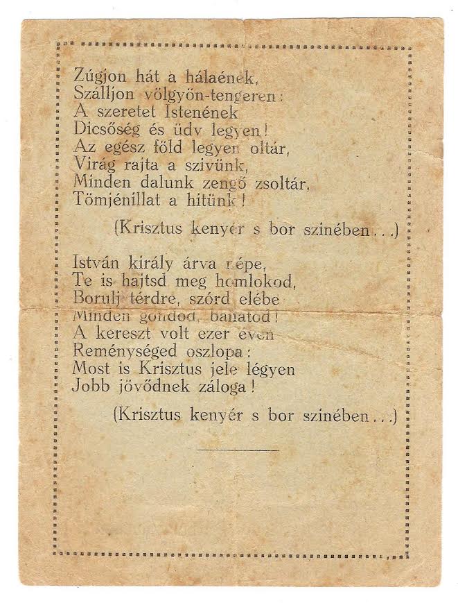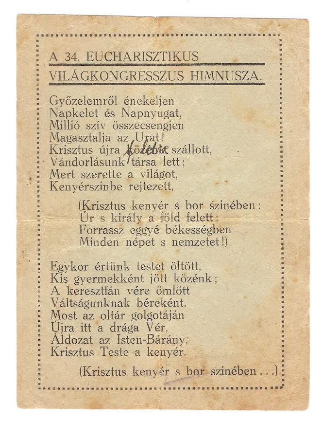 „A 34. Eucharisztikus Világkongresszus himnusza.” – Kisnyomtatvány 1938 májusából. (Kép-forrás: Kerecsényi Zoltán magángyűjteménye, Pápa.)
