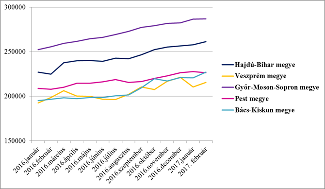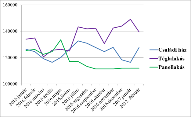A tavalyi évben tapasztalt áremelkedés visszafogottabb volt a 2015-ös boomhoz képest, az ország egyes területein egyenletesen, más régiókban dinamikusabban érvényesült a változás. Pest megyében az országos szinttel megegyező mértékben – 9%-kal - Győr-Moson – Sopronban, Hajdú-Biharban, Bács-Kiskunban 12-13%-kal, Veszprémben pedig 15%-kal változtak az átlagos négyzetméterenkénti árak 2016-ban. Ehhez Veszprémben és Bács-Kiskun megyében szezonalitás is társult, míg a többi, kiemelt területen egységesen emelkedő kép mutatkozott. A növekedés a térségek többségében idén sem állt meg, Hajdú-Biharban és Bács-Kiskunban 2-3%-kal, Győr-Moson-Sopronban 1,5%-kal emelkedtek az átlagos Ft/m2 árak, míg Veszprémben 2,5%-os csökkenés következett be az év első két hónapjában.
