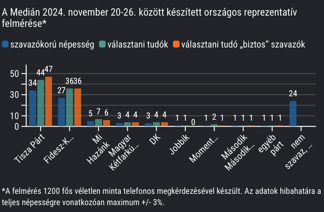 A felmérés szerint Fidesz szavazóinak száma öt százalékponttal csökkent a teljes lakosság körében, 32 százalékról 27-re, miközben a Tisza tábora nem változott, jelenleg a magyar felnőtt lakosság 34 százaléka szavazna a pártra, ahogy október legvégén is.