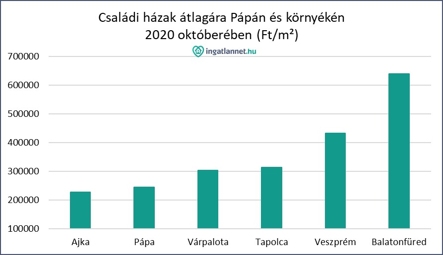 Az Ingatlannet.hu október statisztikai adatait nézve Tapolca és Várpalota a középmezőnyben végzett. Ezeken a településeken az eladó családi házak átlagára 300 és 320 ezer Ft/m² között mozgott. A vizsgált Veszprém megyei települések között a legkedvezőbb áron Pápán és Ajkán lehetett házat venni idén októberben. Pápán mindössze 250 ezer Ft/m²-es átlagáron kínálták eladásra a családi házakat tulajdonosaik. Ajkán pedig ennél kicsivel olcsóbban átlagosan 230 ezer Ft/m²-ért.