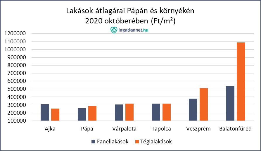 A panellakások tekintetében viszont nem Ajka volt a legolcsóbb, hanem Pápa, méghozzá 250 ezer Ft/m²-rel. Csak ezután következtek Ajka, Várpalota és Tapolca panelei 310 ezer Ft/m²-rel. Veszprém panellakásainak októberi átlagára pedig majdnem elérte a 400 ezer Ft/m²-t, míg a balatonfüredieké meghaladták az 500 ezer Ft/m²-t.