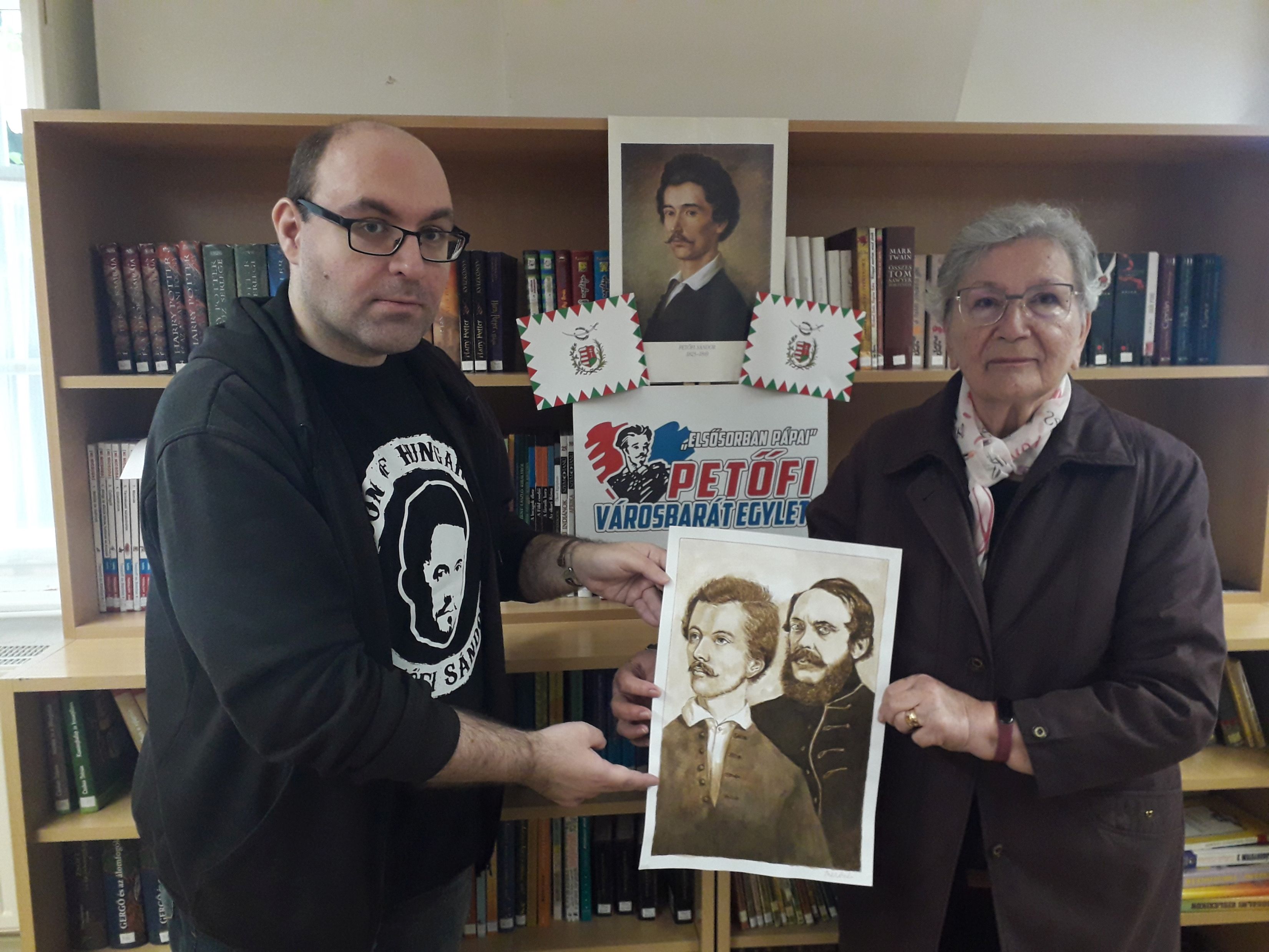 Mező Lászlóné pápai grafikusművész újabb alkotással gazdagította a PVE-t. Diófapáccal készült új alkotásán az egylet névadója, Petőfi Sándor (1823–1849) költő, forradalmár, nemzeti hős, a magyar költészet egyik legismertebb és egyik legkiemelkedőbb alakja – volt pápai diák –, illetve Kossuth Lajos (1802–1894), a 175 éve alakult Országos Honvédelmi Bizottmány elnöke, a nemzeti függetlenségért, a rendi kiváltságok felszámolásáért és a polgári szabadságjogok biztosításáért vívott 19. századi küzdelem egyik legnagyobb alakja, a magyar szabadságharc egyik szellemi vezére – megboldogult pápai díszpolgár – jelenik meg. (Az alábbi fotófelvételen Mező Lászlóné Julika az alkotásával és Kerecsényi Zoltánnal, a PVE ügyvivőjével látható.)