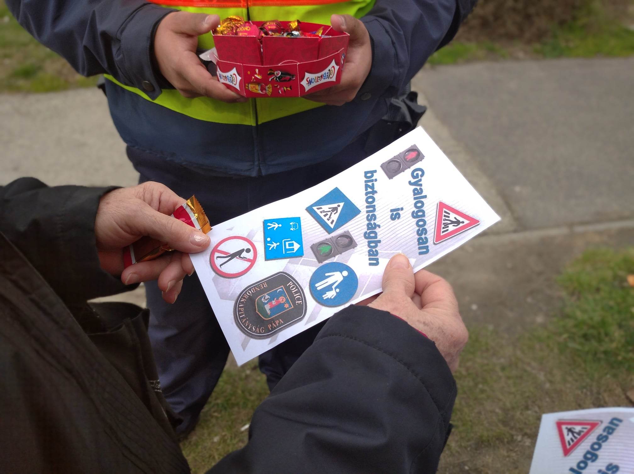 Az édesség mellett a gyalogosok baleset-megelőzési tanácsokat tartalmazó kiadványt is kaptak az egyenruhásoktól, aki arra kérte őket, hogy az úttesten történő átkelés alkalmával körülnézés nélkül soha ne lépjenek az úttestre, még a kijelölt gyalogos-átkelőhelyekhez érve sem.