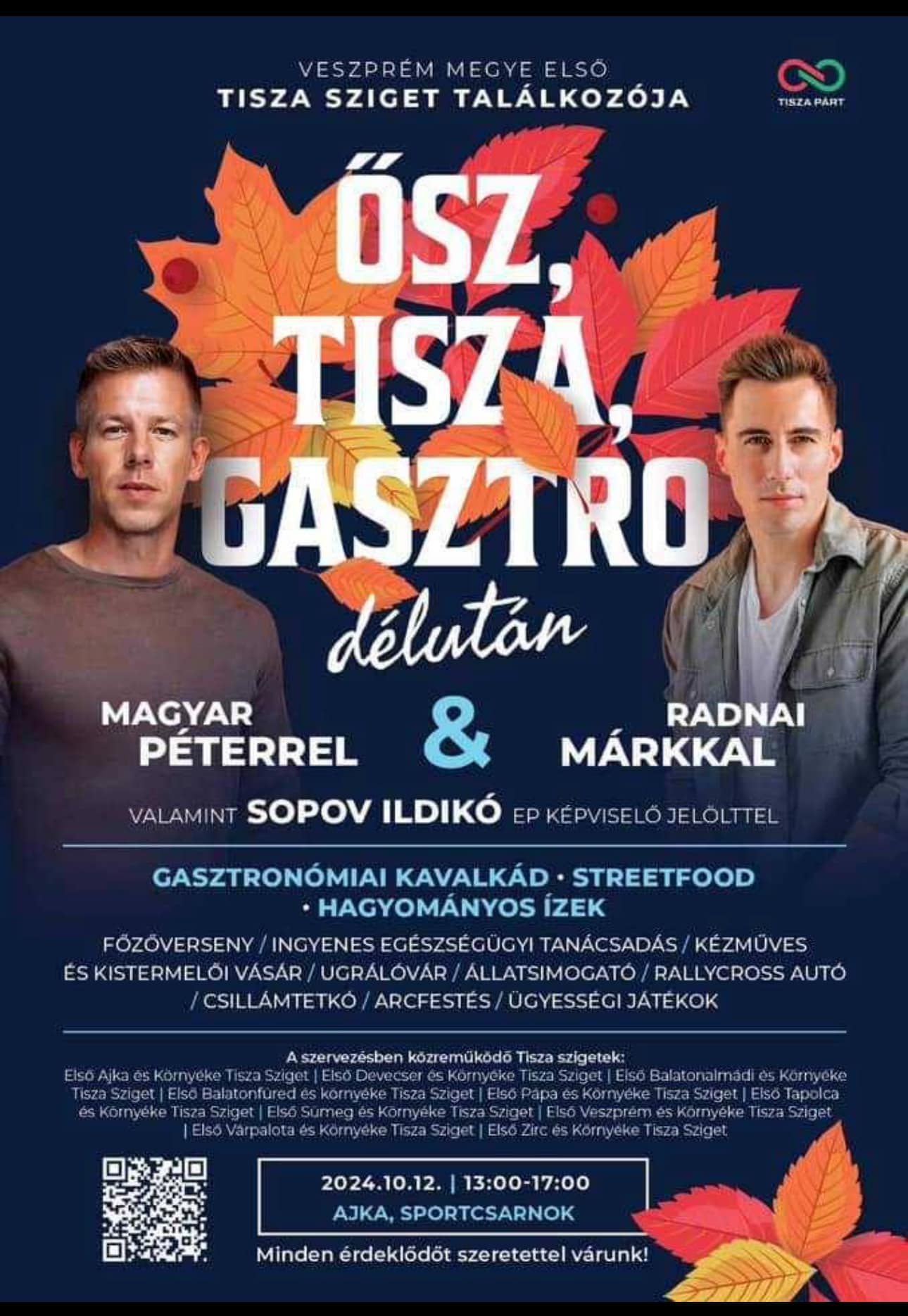 Ősz, Tisza, Gasztro - délután Magyar Péterrel és Radnai Márkkal - Veszprém megye első Tisza sziget találkozója - áll a remdezvény beharangozójában.
