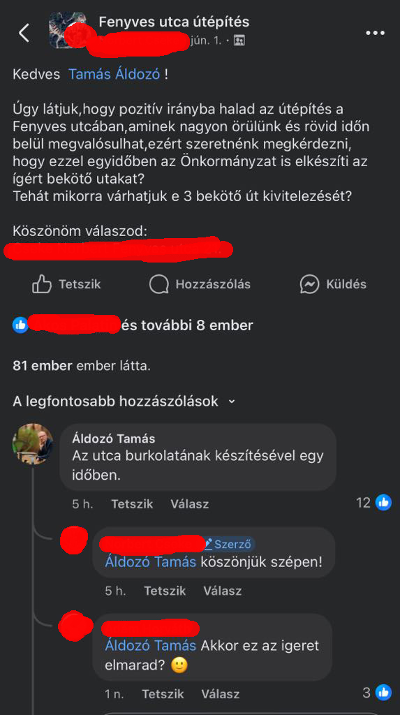 Cikkünk megjelenését követően Áldozó Tamás írt egy bejegyzést az utca lakóinak zárt csoportjában, amelyet olvasónk küldött el szerkesztőségünknek. Az InfoPápa megkeresésére azóta sem reagált a városvezető.