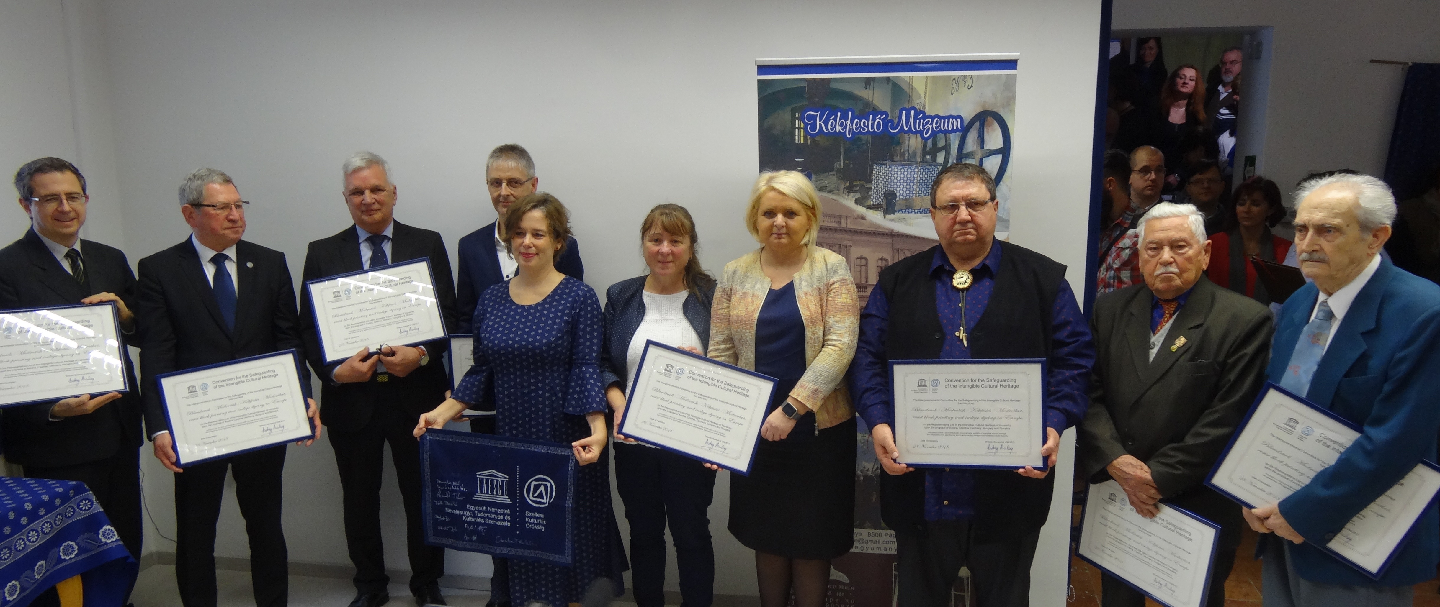 A felvételt igazoló UNESCO-dokumentumot az ünnepségen Csonka-Takács Eszter, Szellemi Kulturális Örökség Igazgatóság igazgatója adta át a bácsalmási, a győri, a nagynyárádi, a szombathelyi, a tiszakécskei és a tolnai kékfestő műhelynek, valamint elismerésben részesült a pápai Kékfestő Múzeum és a magyarországi kékfestés hagyományinak ápolásáért végzett tevékenységéért Domonkos Ottó.