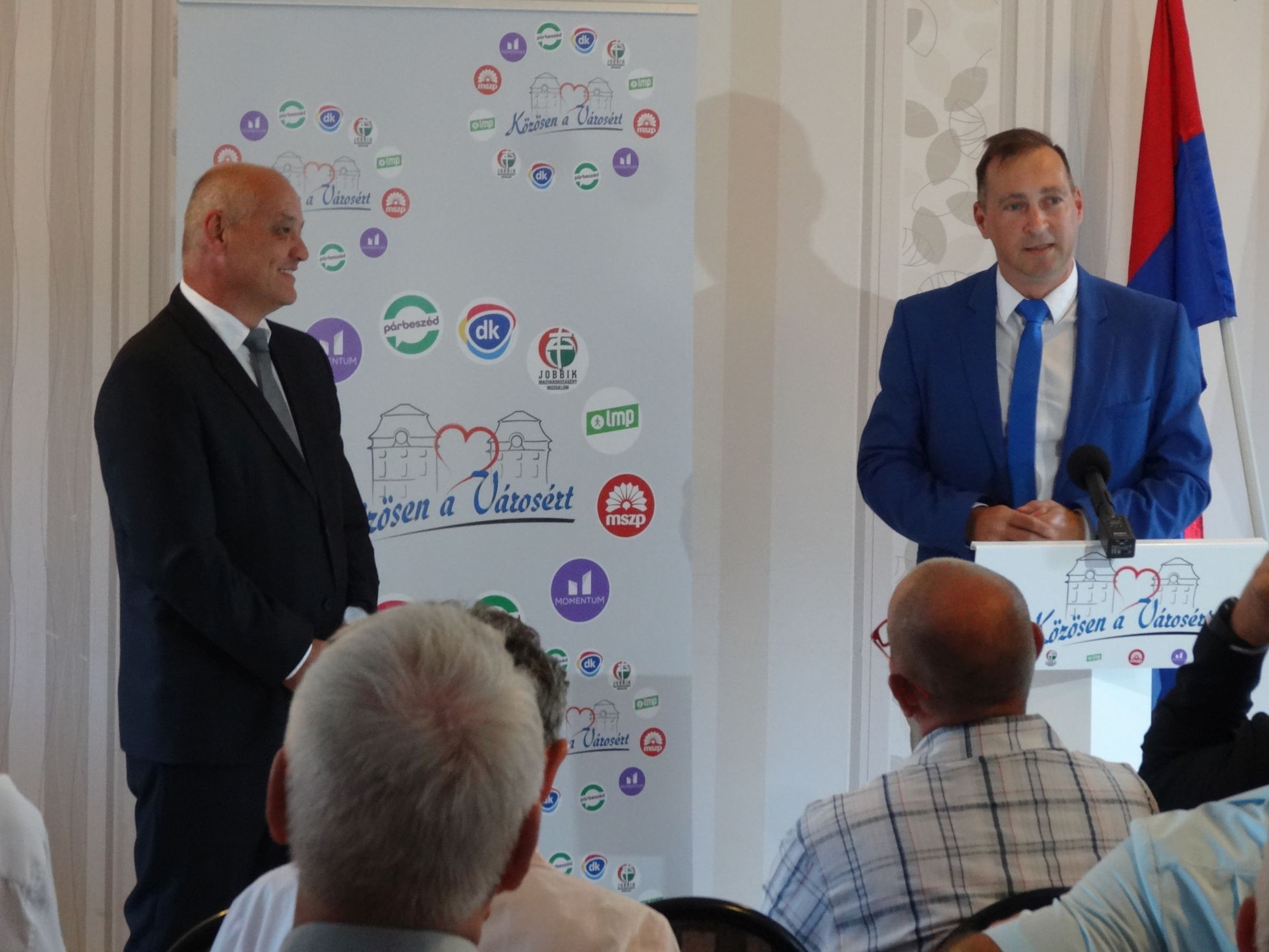 Grőber Attila a jelöltek bemutatását követően kifejtette, az ellenzéki oldalon nem egy a tábor és egy a zászló, sokfélét gondolnak a világról, ám közösen akarják megváltoztatni azt a közösséget, ahol élnek. Ezért hozták létre a Közösen a Városért Egyesületet. Hangsúlyozta, számára Pápa város fejlődése a legfontosabb, ellenfelei nem a Fidesz politikusai, hanem a „járhatatlan járdák és utak, az orvoshiány, a pedagógushiány és a szakmai hozzáértés háttérbe kerülése a politikai lojalitáshoz képest.