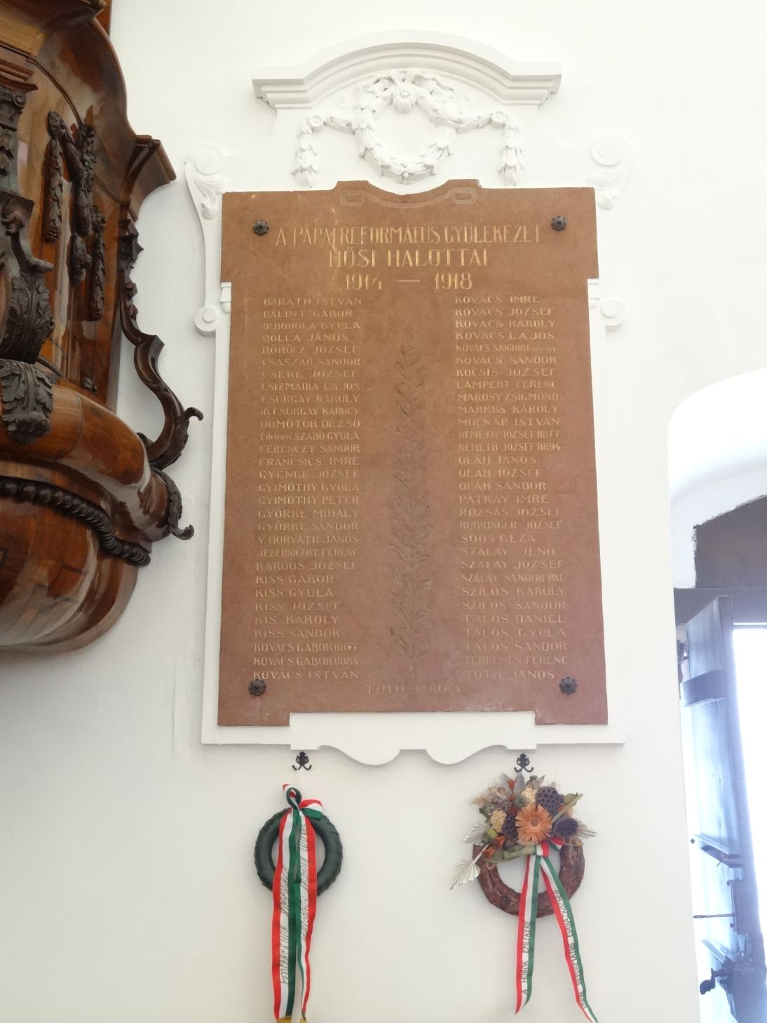 Az első világháborúban hősi halált halt gyülekezeti tagok előtt tiszteleg az ótemplomban álló emléktábla, melyre koszorút helyeztek el a mai megemlékezésen.