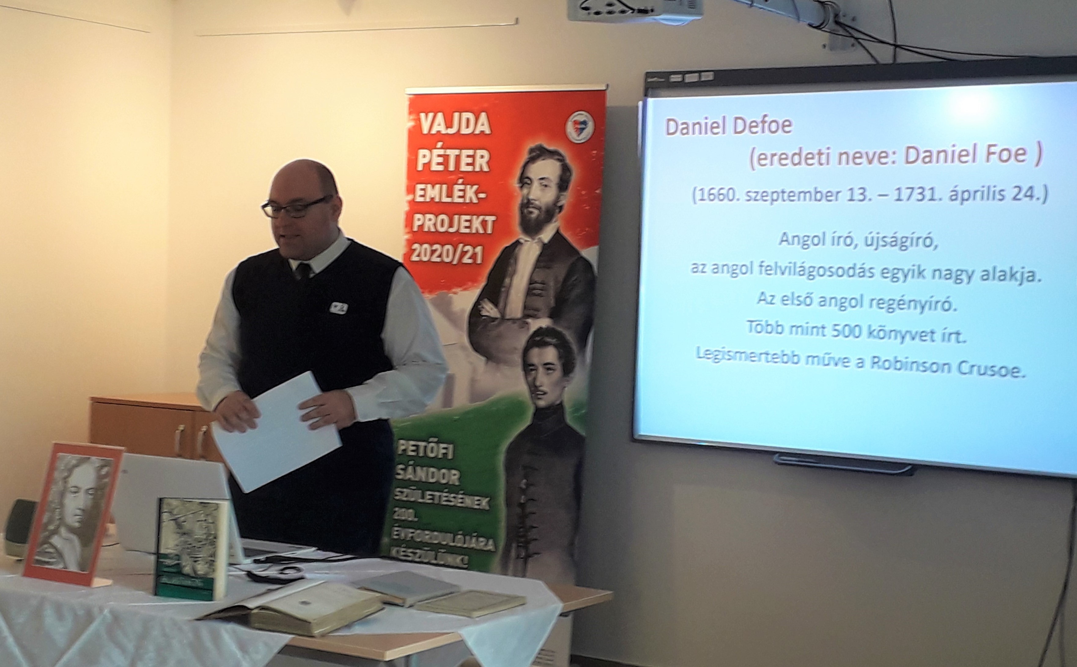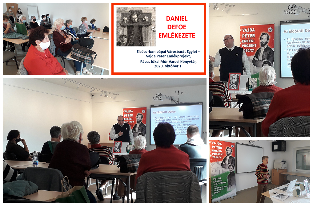 Az emlékkoszorúk elhelyezését követően, a Jókai Mór Városi Könyvtárban Kerecsényi Zoltán előadására került sor, melynek aktualitását Daniel Defoe születésének 360. évfordulója és természetesen a Vajda Emlékprojekt adta, hisz kevesen ismerik, hogy a világ szinte legismertebb és legnépszerűbb regénye, a Robinson Crusoe története a Pápa mellett született Vajda Péter fordításában jelent meg első ízben magyarul úgy 1844-ben, amire először nyomtatták rá Defoe nevét. („A Defoe-Campe-Geiger németül megjelent vonulat első magyar fordításaként” is aposztrofálják ezt egyesek.). Kerecsényi kiemelte, hogy Defoe 1719-es művét – mint a gyermekek számára hasznos, értékes olvasmányt – még a nagy filozófus, Rousseau is a szülők és nevelők figyelmébe ajánlotta „Emil, avagy a nevelésről” című pedagógiai művében, 1762-ben. (Érdekességként az előadó – gyűjteményéből – az „Emil, avagy a nevelésről” egy több mint százhúsz éves magyar kiadású példányát kézbe is adta megtekintésre a jelenlévőknek.)