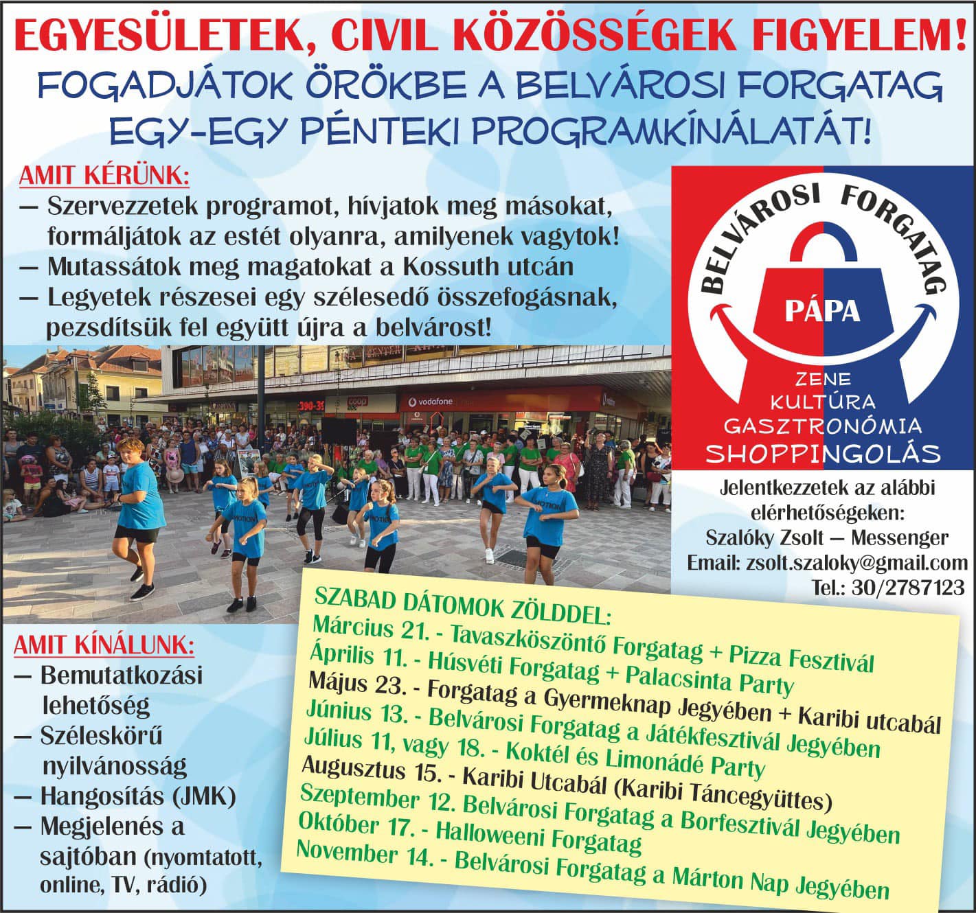 Immáron több mint egy éve annak, hogy a belváros újjáélesztése érdekében összefogtak a belvárosi üzletek. Sok szép sikert megélt ez a kezdeményezés, amelynek köszönhetően életjeleket kezd mutatni a Kossuth utca. A pápai önkormányzattal együttműködve idén is azt tervezik az üzletek, hogy havonta egy pénteki napon hosszabb nyitva tartással, kedvezményekkel és programokkal készülnek. Annak érdekében, hogy az alkalmak továbbra is alulról szerveződő módon jöjjenek létre, azt szeretnék, ha civil szervezetek, egyesületek is bekapcsolódnának a szervezésbe, és egy-egy pénteki alkalmat örökbe fogadnának. Bemutatkozási lehetőséget kapnának a széles nyilvánosság előtt, ahol megmutathatnák magukat.