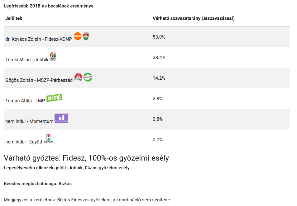 A 24.hu és a Közös Ország Mozgalom választókerületi szintű méréseit közli a taktikaiszavazas.hu. Az oldal szerint a jelenlegi adatok szerint az ellenzéknek az sem segítene, ha koordináltan indulnának (amit egyébként a Jobbik és az MSZP is kizárt).