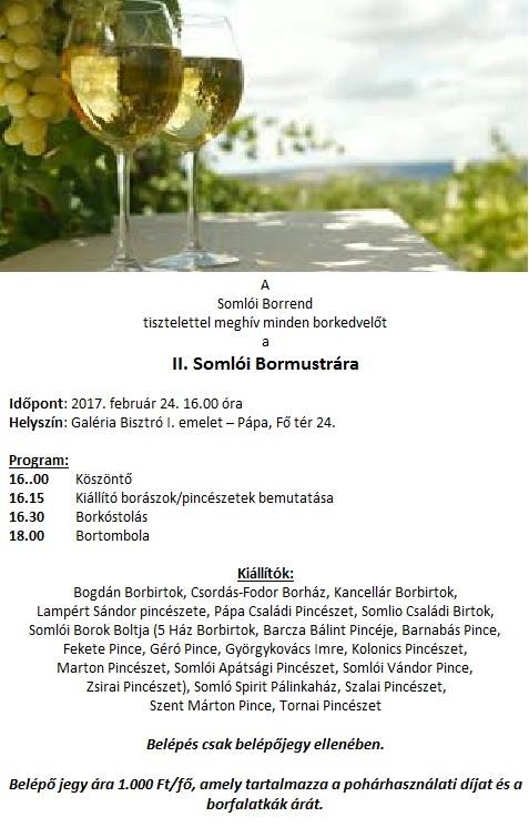 A Somlói Bormustrán zenei aláfestés mellett mutatják be a kiállító borászatokat és boraikat. A rendezvény végén bortombolával is várják a látogatókat. A Galéria Bisztró emeleti termében tartandó rendezvényre a belépő 1000 Ft.