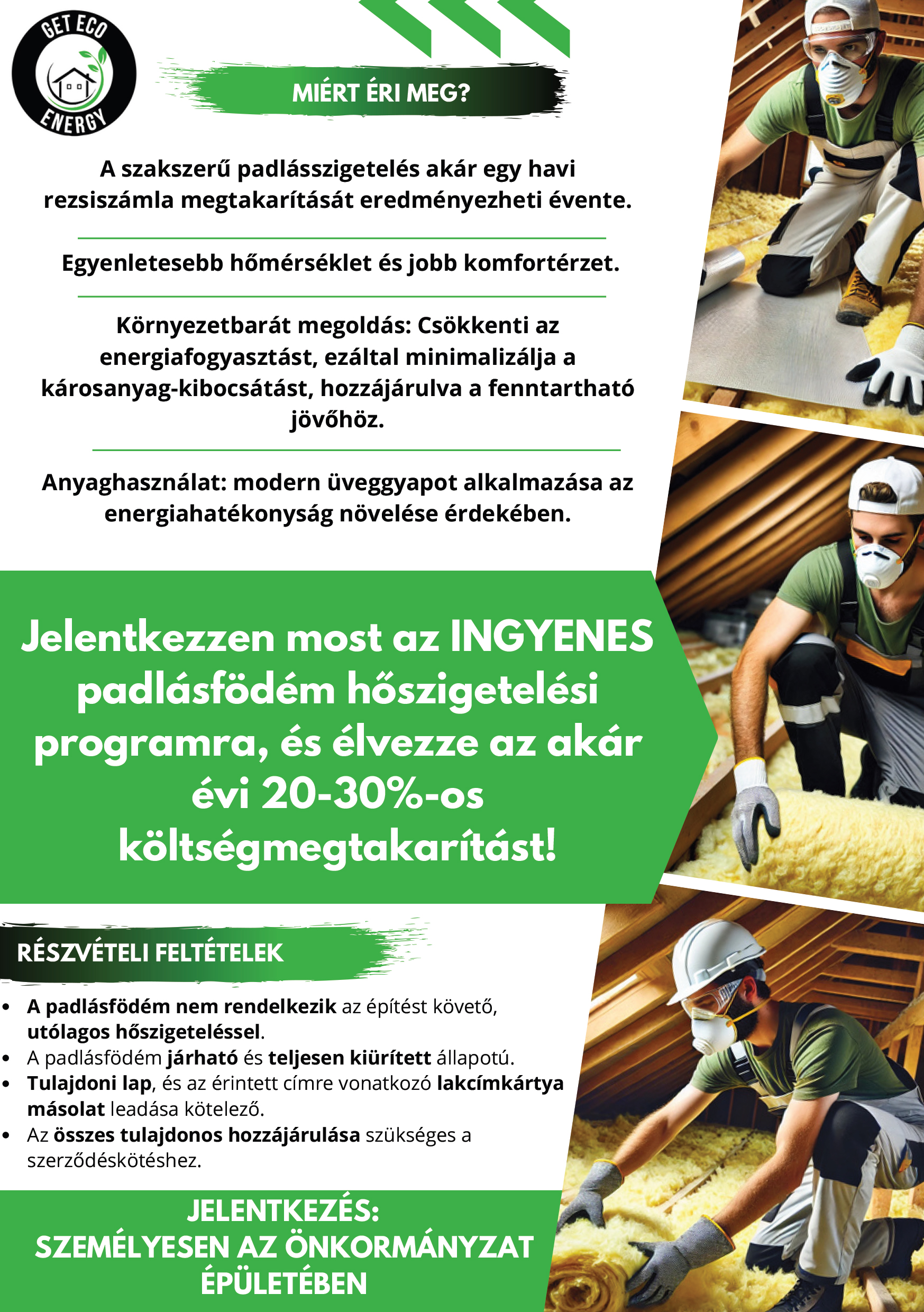 A helyi önkormányzat támogatásával elindított padlásfödém szigetelési kezdeményezés keretében a Get Eco Energy Kft. szakemberei minden munkálatot teljesen díjmentesen végeznek el.