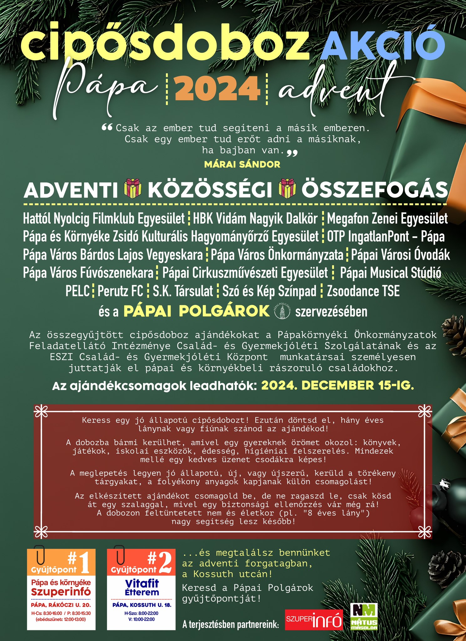 Minden várakozást felülmúló mennyiségű adomány érkezett tavaly a Pápai Polgárok által meghirdetett cipősdoboz gyűjtő akció során, amelyek egytől egyig pápai, vagy Pápa környéki nehéz sorsú családok karácsonyfái alá kerültek. A civilek számára nem volt kérdés, hogy ezúttal is megszervezik a segítségnyújtó akciót, sőt, idén számos egyesület csatlakozott hozzájuk.