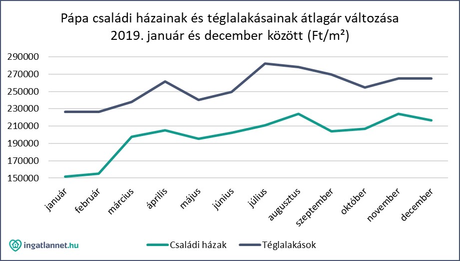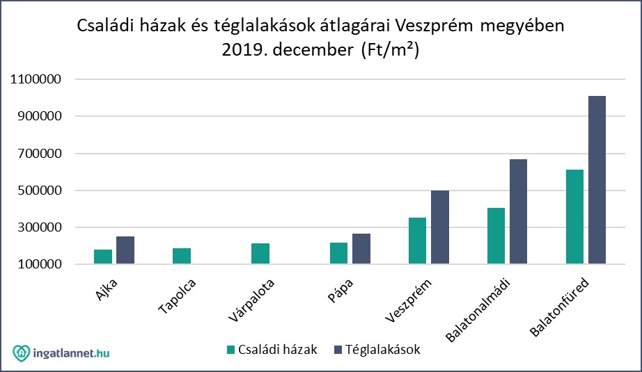 Családi házak tekintetében Pápa 2019. decemberi 220 ezer Ft/m² átlagáránál Veszprém négyzetméterenként 130 ezer forinttal, Balatonalmádi 180 ezer forinttal, Balatonfüred pedig 400 ezer forinttal volt drágább. Ugyanezen időszakban Pápával megegyező négyzetméteráron kínálták a családi házakat Várpalotán, míg Tapolcán és Ajkán négyzetméterenként 30-40 ezer forinttal olcsóbban.