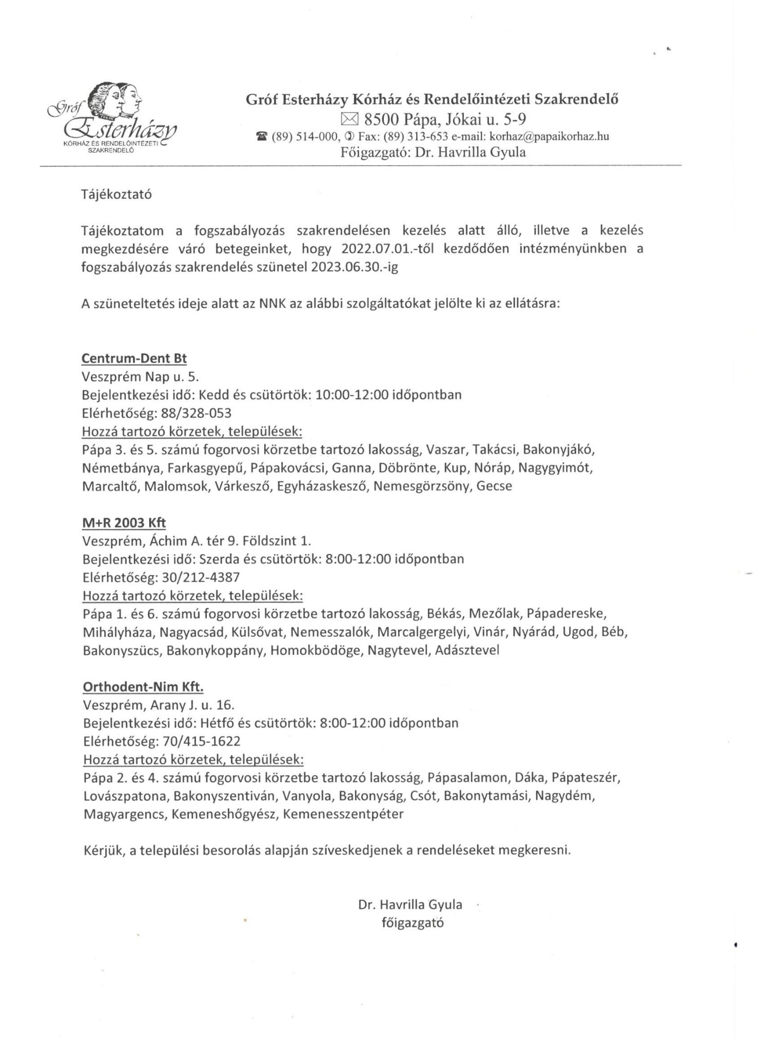 A Gróf Esterházy Kórház és Rendelőintézeti Szakrendelő tájékoztatása szerint az intézményben 2023. 06. 30-ig szünetel a fogszabályozás, Veszprémbe kell átjárniuk a pápaiaknak és környékebelieknek.