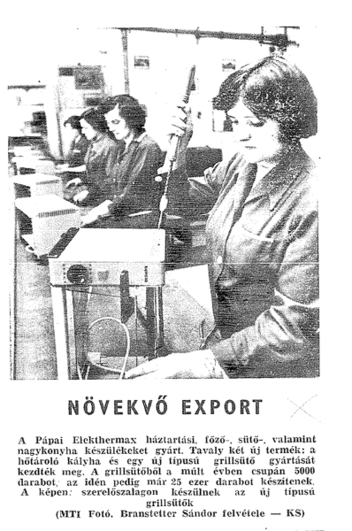 Az export néhány európai országra, valamint a Közel-Keletre vonatkozott. Az exportált gyártmányok különféle vasalók, rezsók, kenyérpirítók, majd a KGST-n belüli együttműködés keretében padlókefélő gépek, nagykonyhai berendezések voltak.