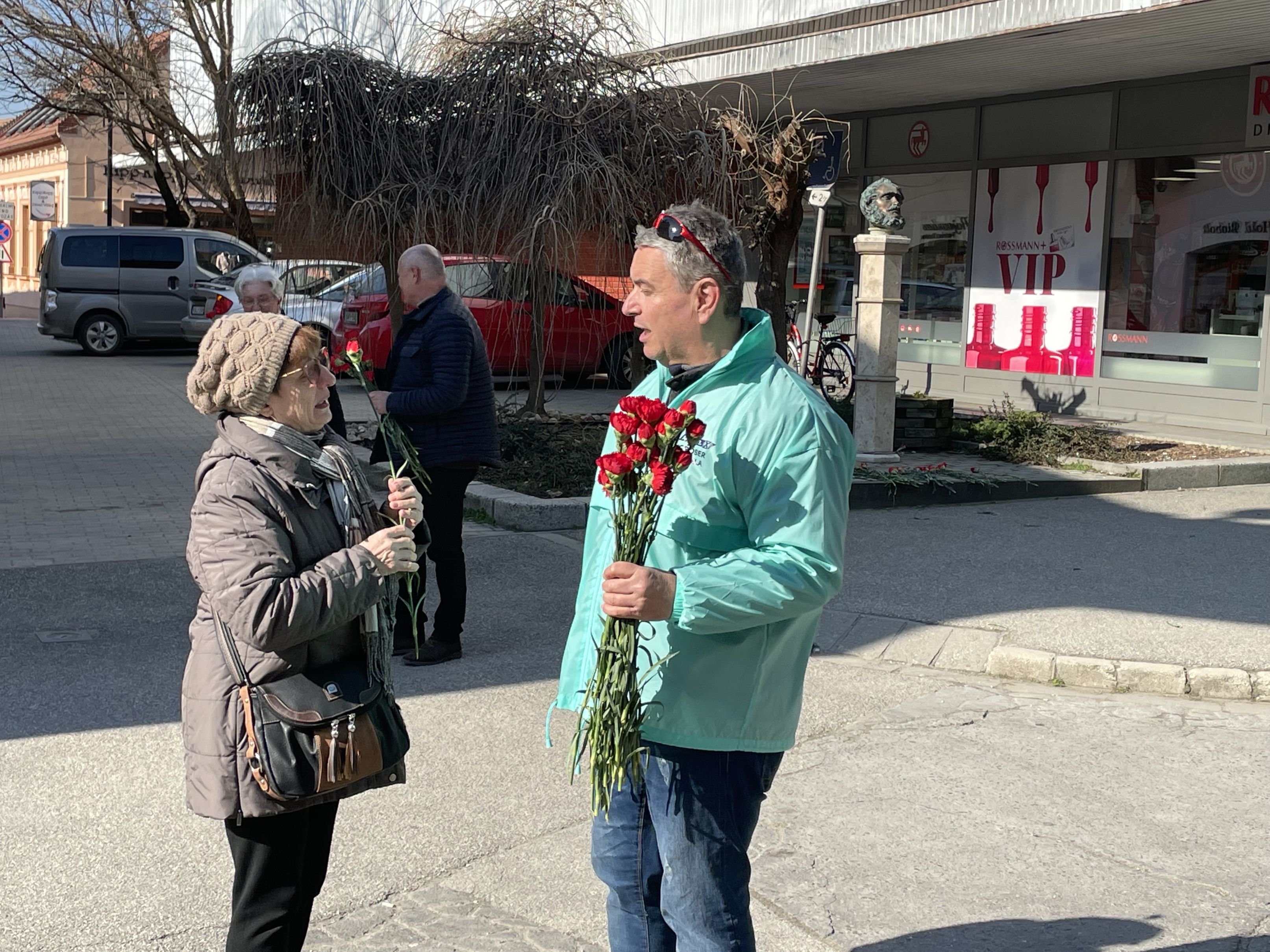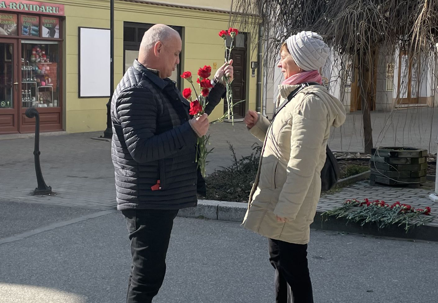 A nemzetközi nőnap alkalmából a pápai Kossuth utcán állították meg néhány szóra az arra közlekedő hölgyeket és lepték meg őket egy szál virággal helyi ellenzéki politikusok.