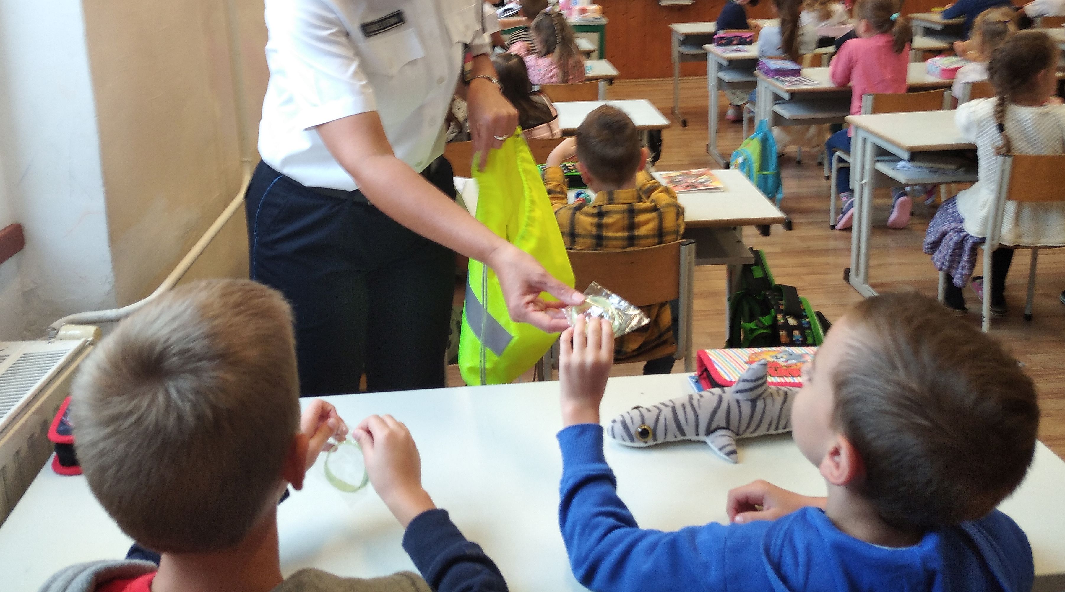 A tanév első napján az iskolarendőrök a pápai Gyurátz Ferenc Evangélikus Általános Iskola 1. osztályosait köszöntötték, akiket fényvisszaverő karkötővel ajándékoztak meg.