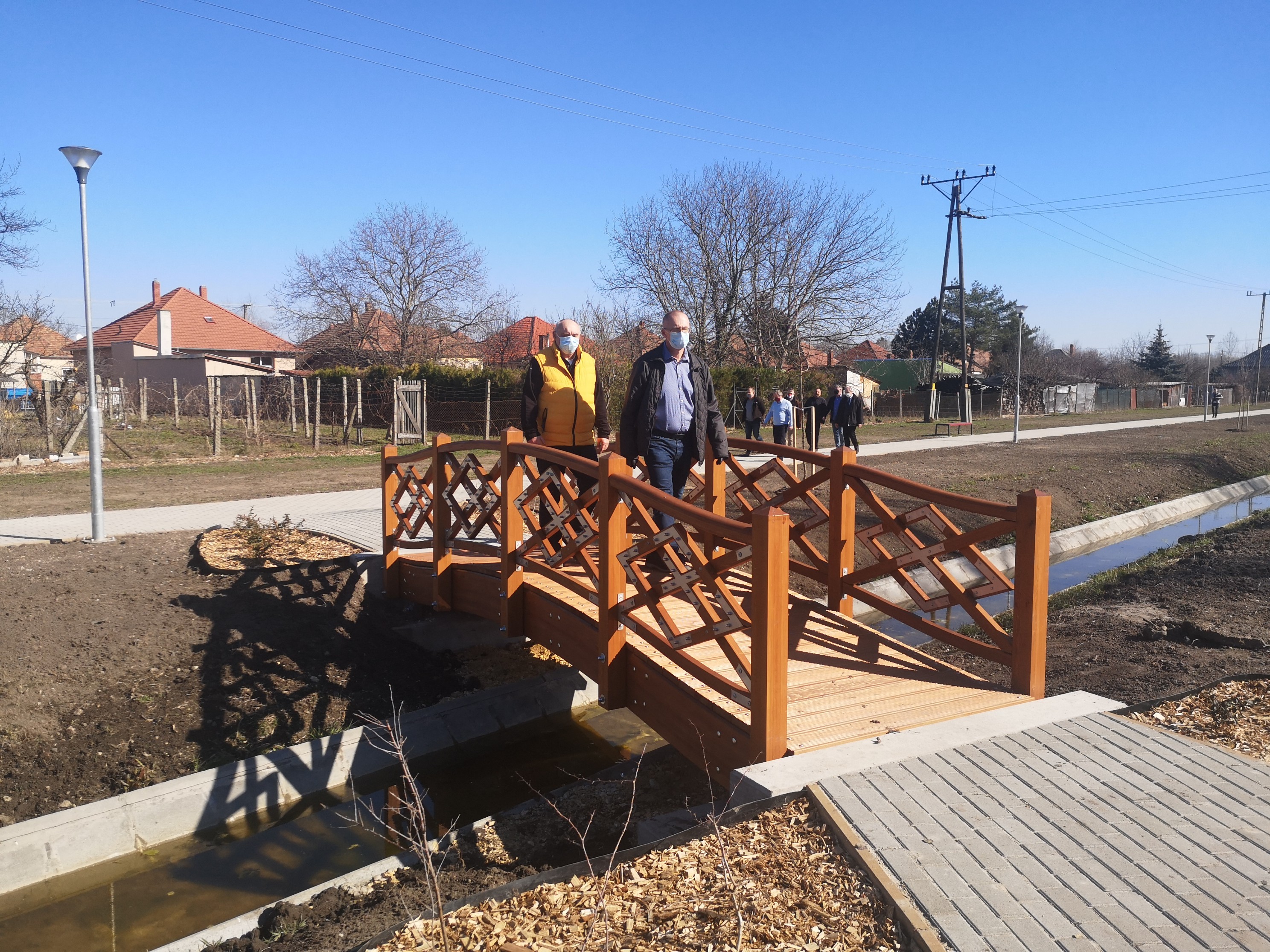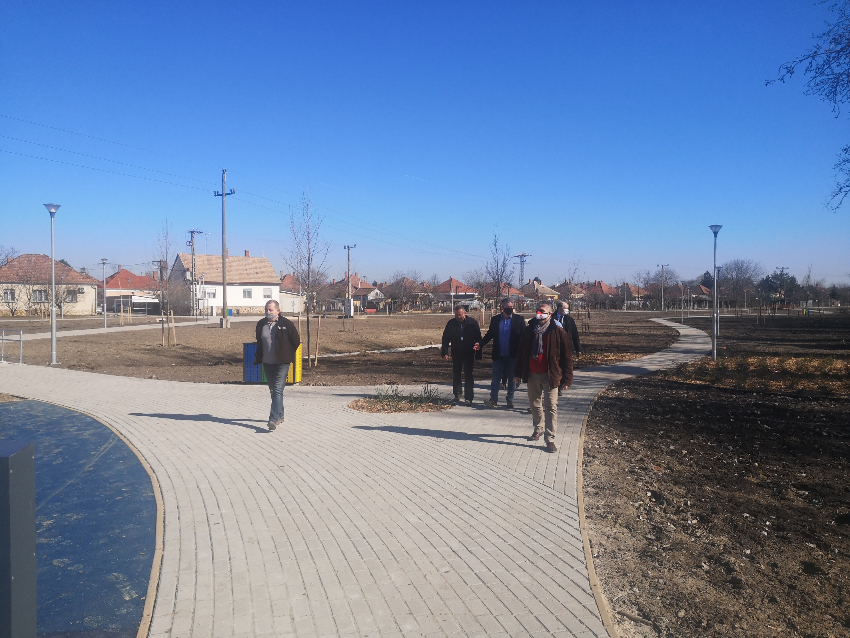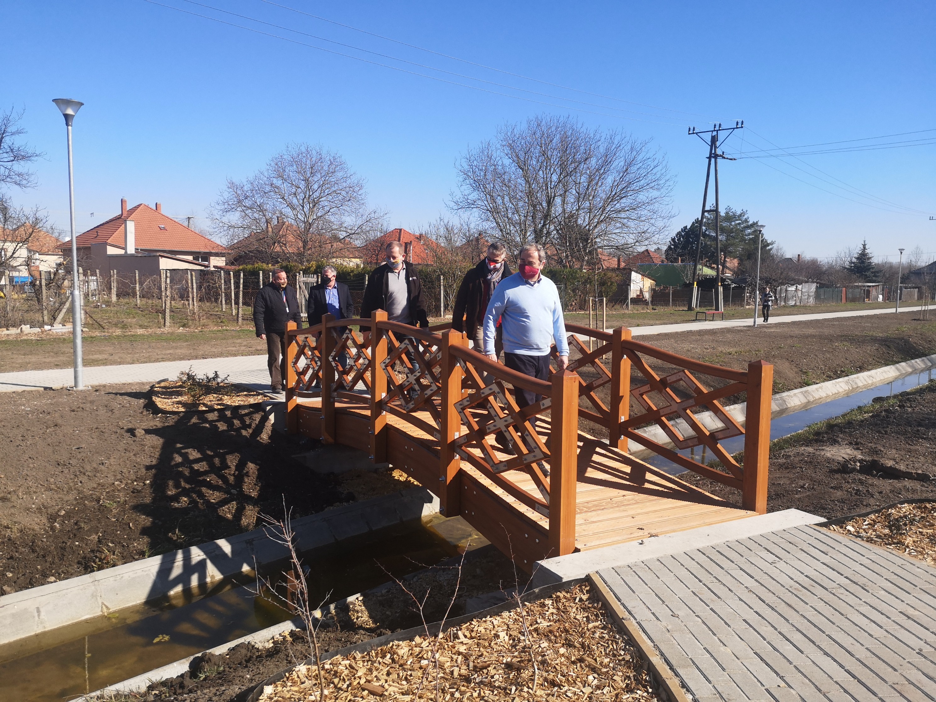 Az új park Téglagyári úti bejáratát eddig lezáró kordonokat dr. Kovács Zoltán országgyűlési képviselő, dr. Áldozó Tamás polgármester, Boross Ottó, a kivitelező Vemévszer Kft. ügyvezetője és Csehi Lóránt létesítményfelelős, valamint Venczel