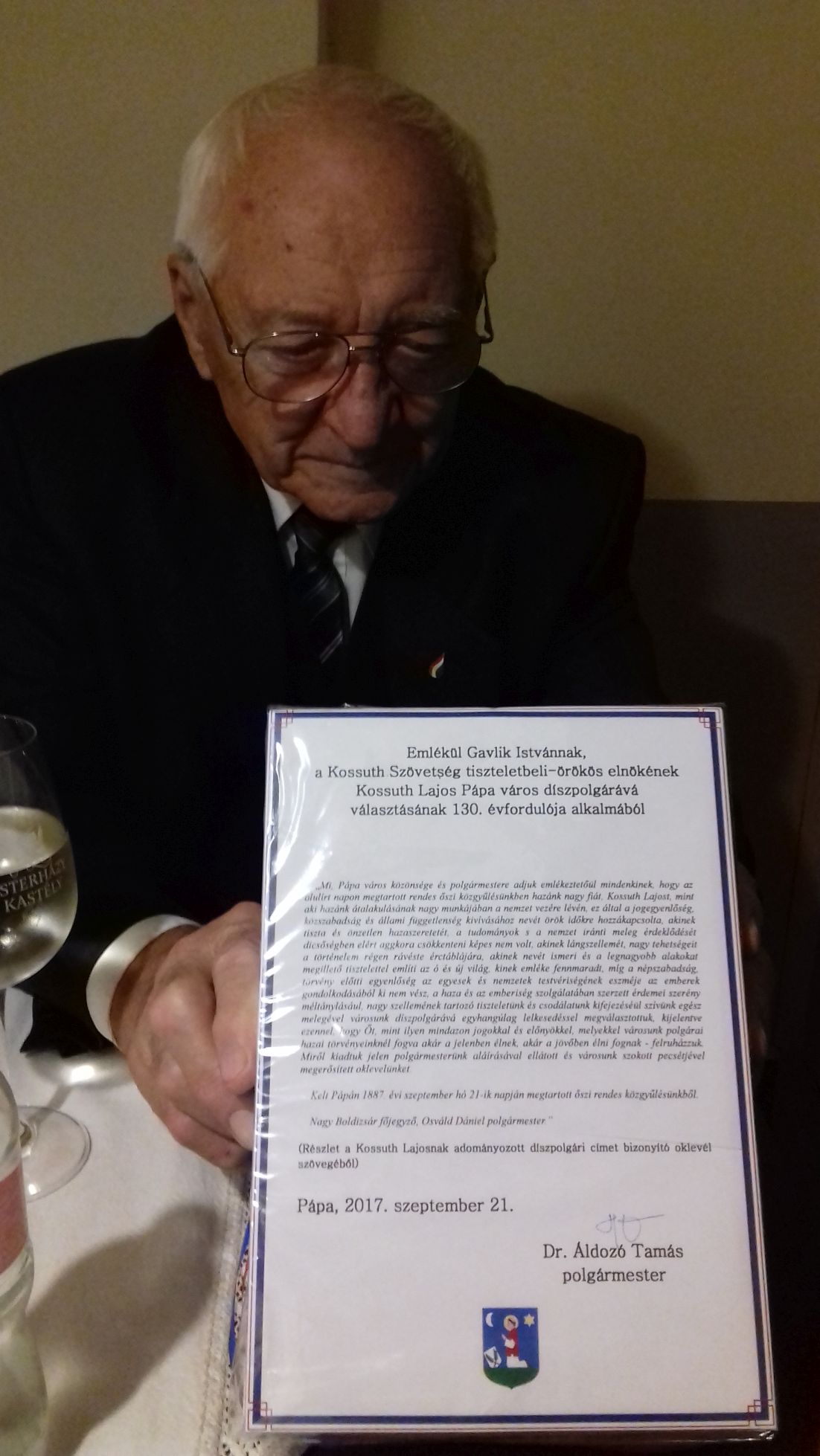 Az elmúlt hétvégén nyolcvanöt esztendős korában elhunyt Gavlik István, a Kossuth Szövetség néhai országos elnöke, örökös tiszteletbeli elnöke, jeles magyar patrióta, pedagógus, Kossuth-kutató. Neve, alakja nem lehet ismeretlen a Veszprém megyeiek, a pápaiak és a város környékén élők előtt!