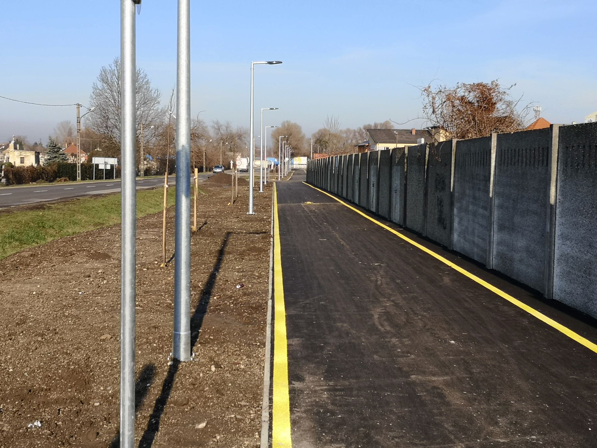 A kerékpárút építését – a hozzá kapcsolódó körforgalommal egy időben – nyár végén kezdte meg a kivitelező. A kerékpárút kialakításán túl gondoskodtak a csapadékvíz megfelelő elvezetéséről és felülvizsgálták a közvilágítást. Ennek eredményeképpen 14 közvilágítási lámpát helyeztek el az aszfaltcsík mentén.