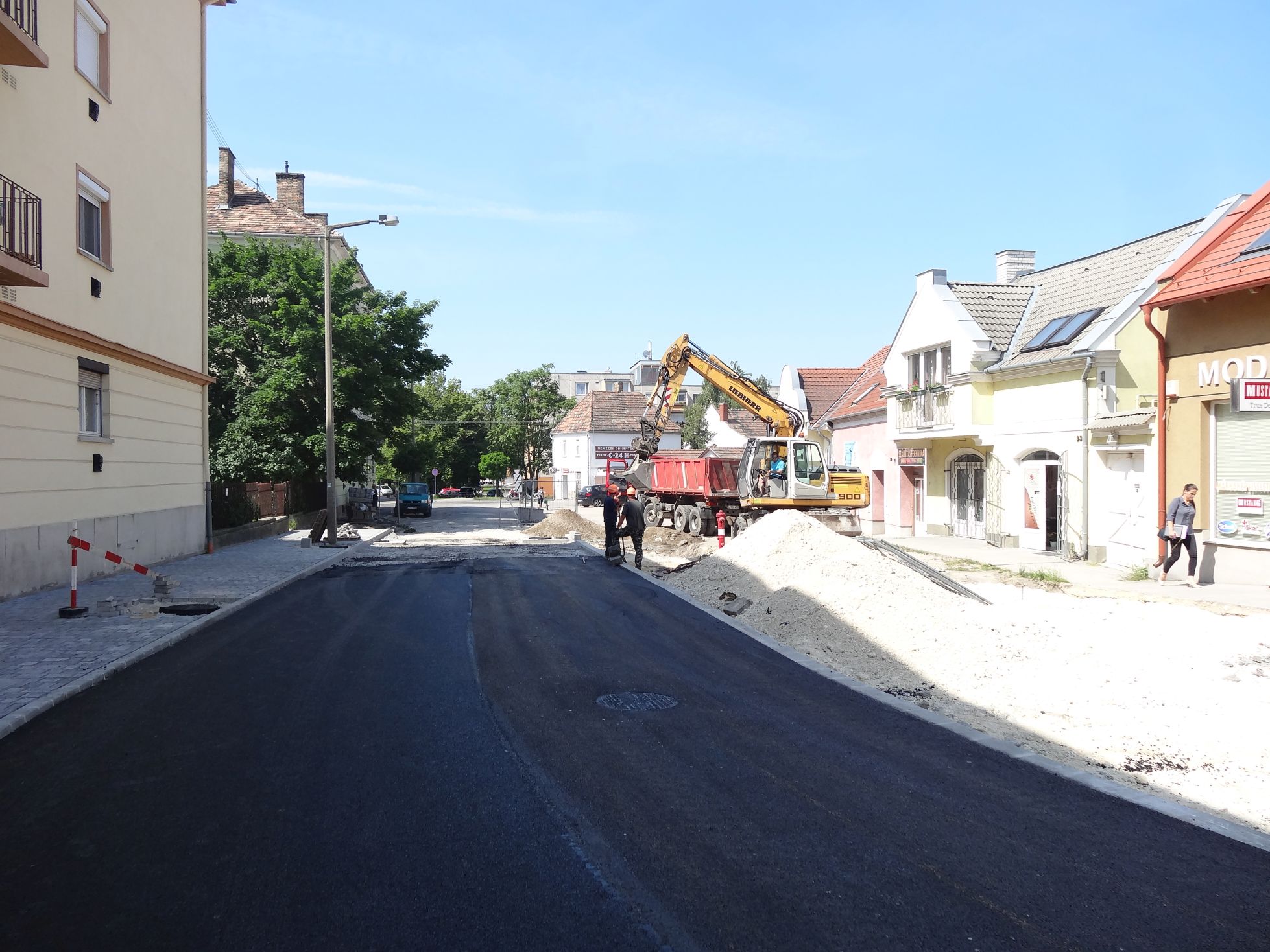 Az utca Korona utca felőli végén járda és parkolóépítés zajlik jelenleg, de a körforgalom kialakítása továbbra sem kezdődhet el. Vörös Lászlótól, a kivitelezést végző cég vezérigazgatójától megtudtuk, egy várost ellátó gázvezeték húzódik az út alatt, melynek kiváltását írják elő a tervek. Ezt a munkát olyan alvállalkozó végezheti, amely az E.ON-nal szerződésben áll, mindössze három ilyen társaság van a dunántúlon és az építőipar felfutása miatt komoly kapacitás problémával küzdenek. A munkálatok erre a hónapra vannak beütemezve, Vörös László bízik benne, hogy valóban el is kezdődik végre a gázvezeték kiváltás, melyet teljes útzár mellett végeznek majd.