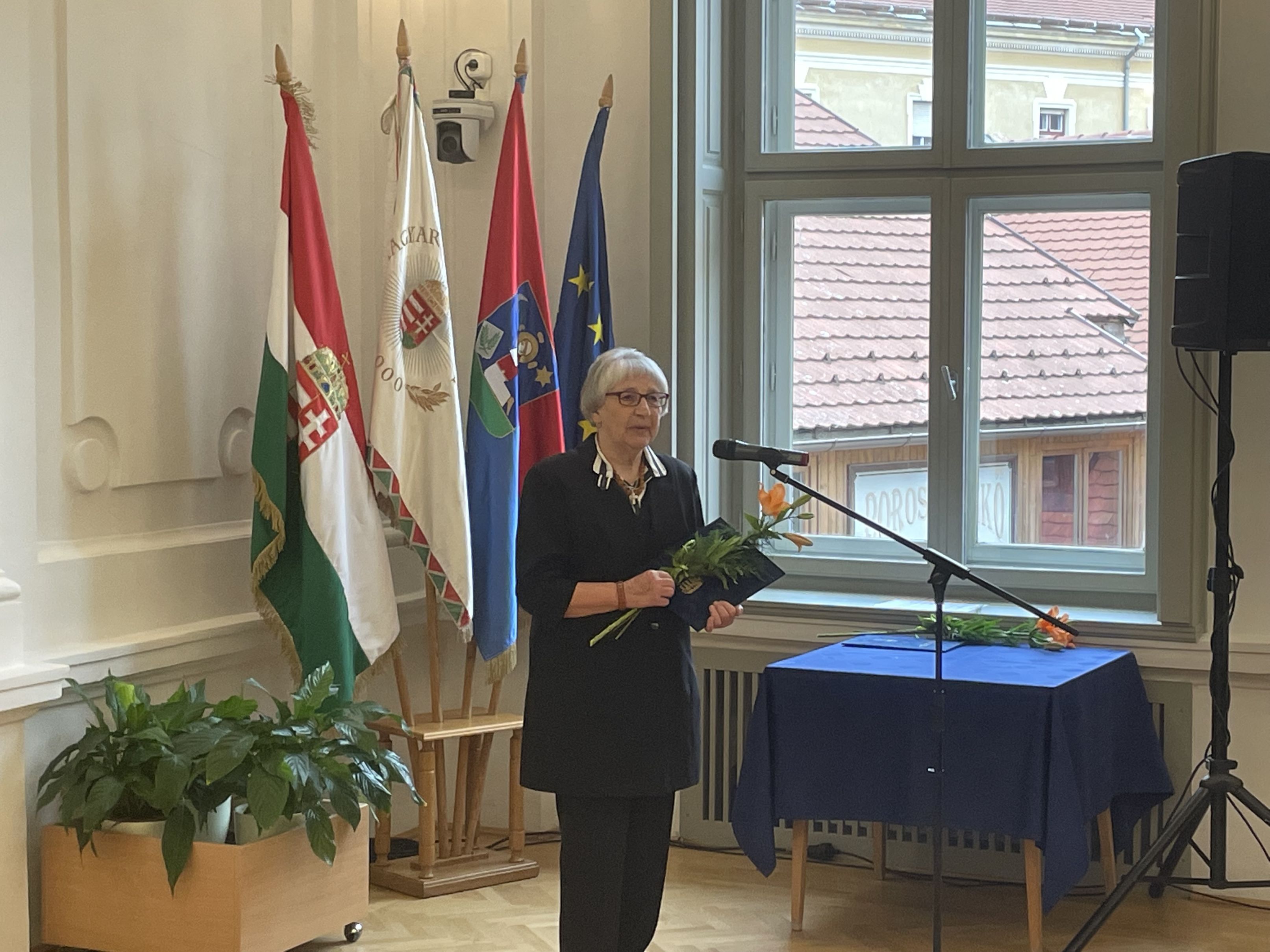 A pedagógusok nevében Páter Mihályné mondott köszönetet a pápai önkormányzatnak, majd pedig Váci Mihály versét szavalta el.