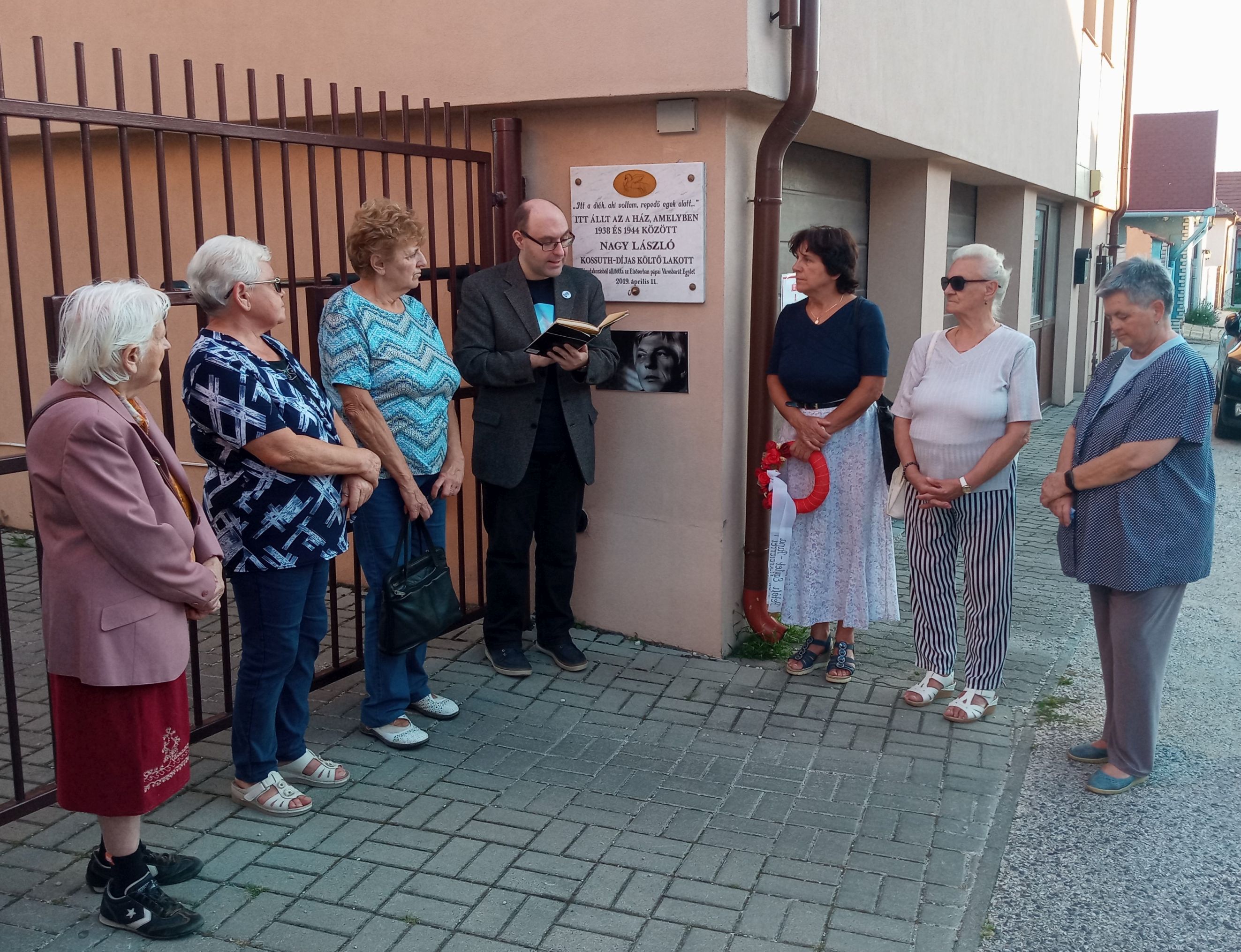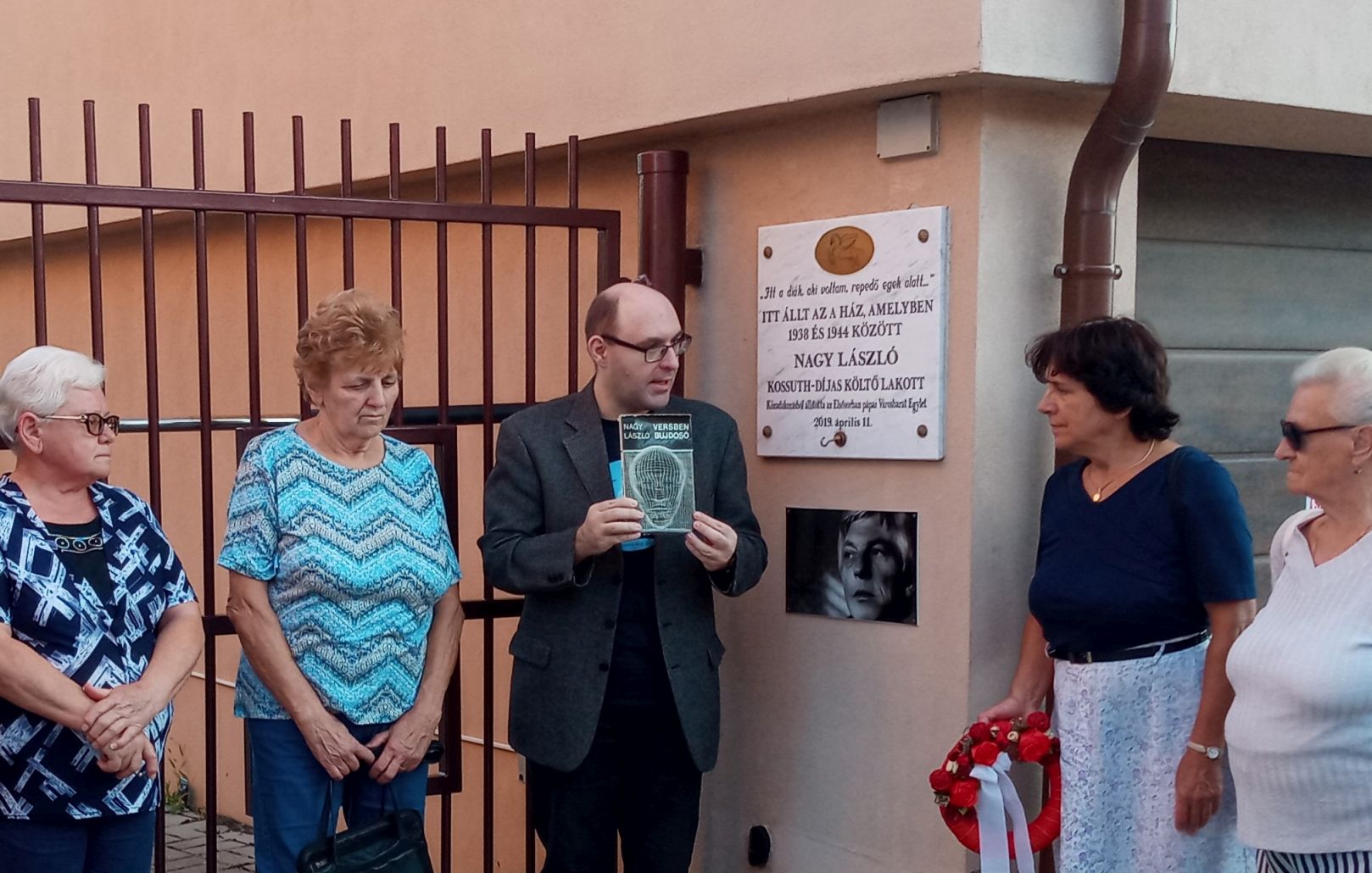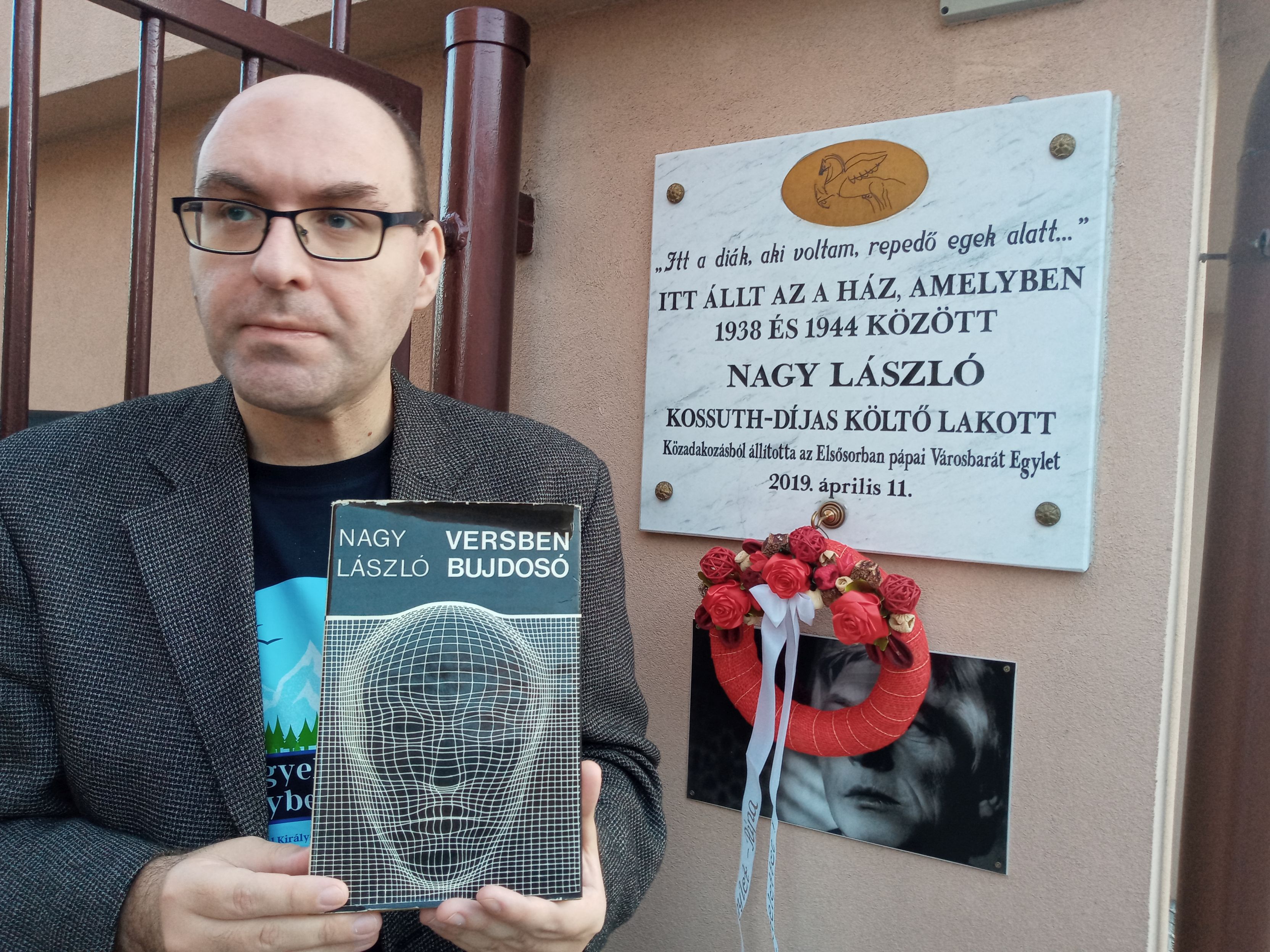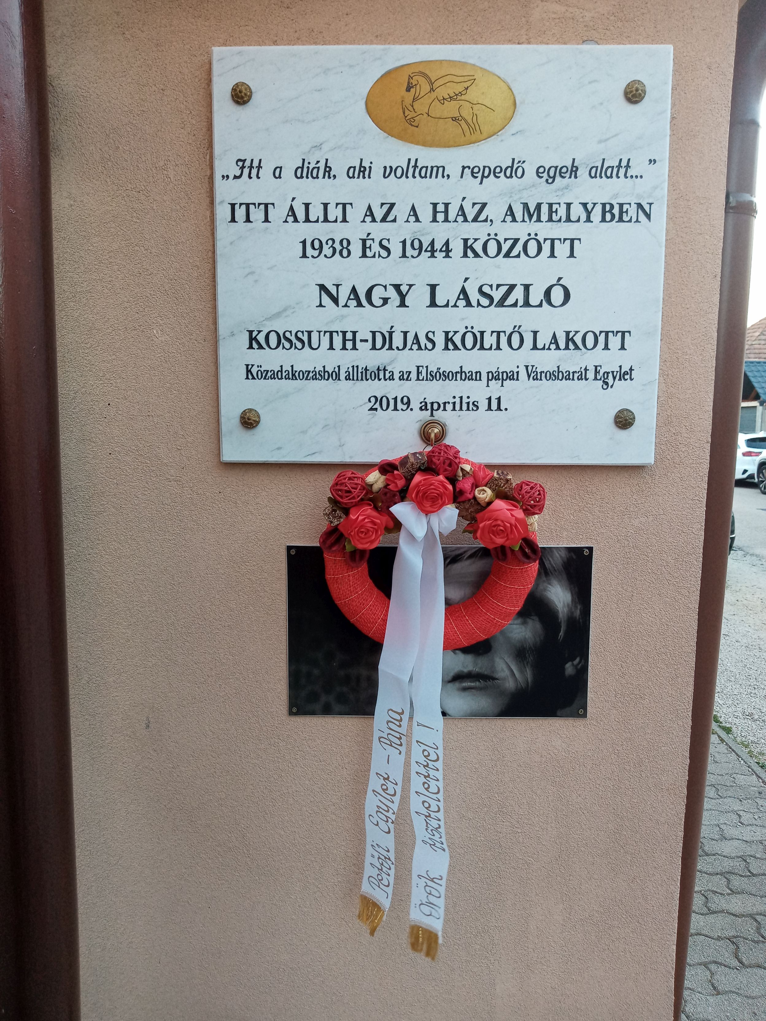 Valamikor az emléktábla helyén állt az a kis épület, ahol a polgári és a középiskolás évek idején az özvegy nagymama szoba-konyhás otthonában a nővéreivel és az unokatestvéreivel együtt lakott az ifjú költő. Nagy László éppen 85 éve, 1938-ban kezdte meg tanulmányait Pápán, a hajdani Római Katolikus Polgári Fiúiskolában, és öt évtizede, 1973-ban jelent meg nagy jelentőségű kötete, a Versben bujdosó.