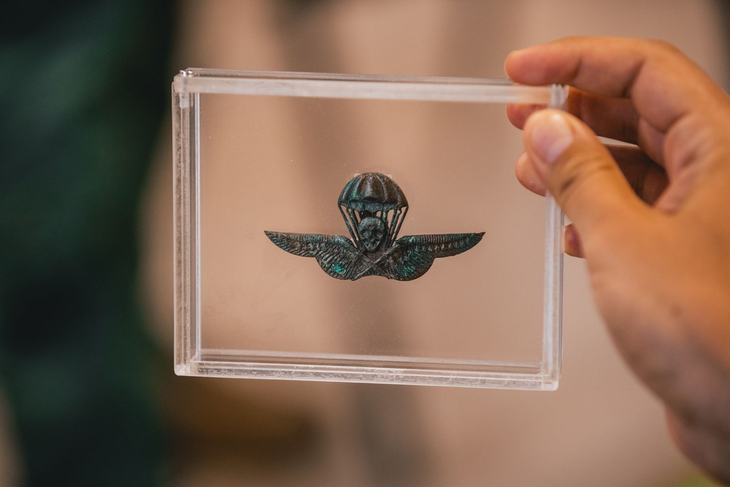 Ez a jelvény térhetett „haza” ideiglenesen az MH Pápa Bázisrepülőtérre, ahol a Sülysápnál elesett katonák tiszteletére a feltárásról és a leletekről tartott előadást Maruzs Roland alezredes, a HM HIM Katonai Emlékezet és Hadisírgondozó Igazgatóság (KEHI) Belföldi Hadisírgondozó Osztályának vezetője, Dr. Sallay Gergely főtanácsos, a HM HIM Dokumentációs Osztályának vezetője pedig az ejtőernyős jelvény történetéről árult el érdekes részleteket. Ezt követően Dr. Papp Ferenc ezredes, a HM HIM KEHI igazgatója hivatalosan átadta a restaurált relikviát ideiglenes megőrzésre Magasy Zsolt ezredesnek, az MH Pápa Bázisrepülőtér parancsnokának.