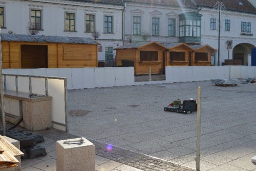 Ezzel párhuzamosan a jégpályát határoló falakat és a faházakat is a helyszínre szállította a Városgondnokság. A kiszolgáló helyiségként működő faházakat már tegnap felépítették, a kordonokkal ma dolgoztak a szakemberek a mintegy 1000 négyzetméteres területen.