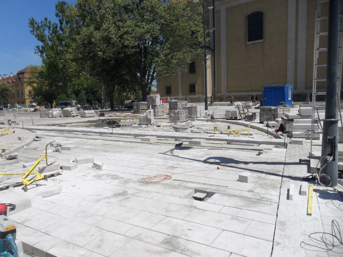 A Korvin utcai csatlakozásnál a felület vélhetően nem készül el teljes egészében, a szélső gránitkövek beszabása ugyanis nagyon lassan megy, részben azért mert nagyon sok gránitkövet kell méretre igazítani, részben pedig azért, mert itt 12 cm vastag kövekkel dolgoznak. Az biztos, hogy ezen a területen is biztosítja a kivitelező a balesetmentes közlekedés feltételeit.