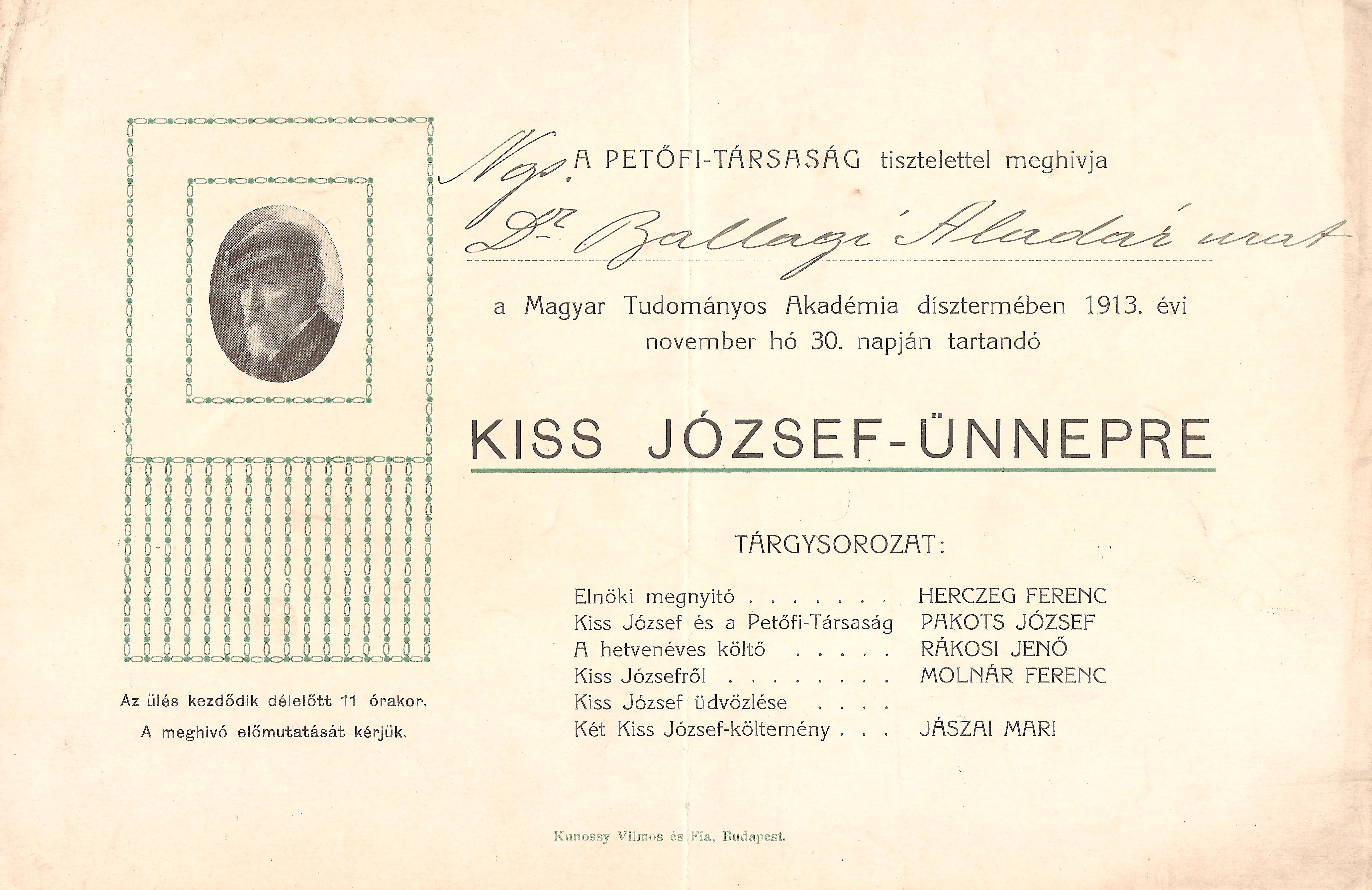 A Petőfi-kultusz terjesztését, valamint a magyar szépirodalom nemzeti szellemben való művelését 1876 és 1944 között hűen végző Petőfi Társaság ezzel a meghívóval hívta-várta 1913. november 30-ra, a Magyar Tudományos Akadémia dísztermébe tagjait és vendégeit Kiss (Klein) József (1843–1921) költő felköszöntésére. Ekkor ünnepelték ugyanis a Társaság oszlopos tagjának, a korabeli Magyarország legnépszerűbb rímfaragójának, A Hét című folyóirat (a Nyugat előfutára) alapító-szerkesztőjének kerek 70. születésnapját. A kivételes eseményen – a mára már szépen megsárgult jubileumi invitáció tanúsága szerint – az akkori irodalmi-művészeti élet olyan személyiségei működtek közre, mint Herczeg Ferenc, Pakots József, Rákosi Jenő, Molnár Ferenc és Jászai Mari.
