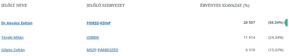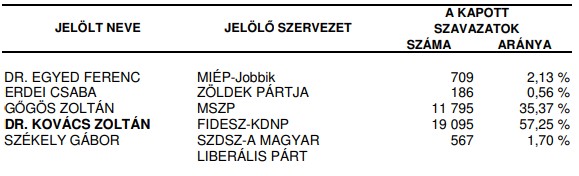 Összegezve tehát a leírtakat: a vasárnapi választás toronymagas esélyese dr. Kovács Zoltán, már egy szoros eredmény is meglepetésszámba menne, de természetesen a meccsnek akkor van csak vége, ha a bíró hármat fújt a sípjába. Sok múlhat a mozgósításon, hiszen ha például a fideszesek elkényelmesednek, mivel zsebben érzik a győzelmet, akkor akár meglepetés is születhet.