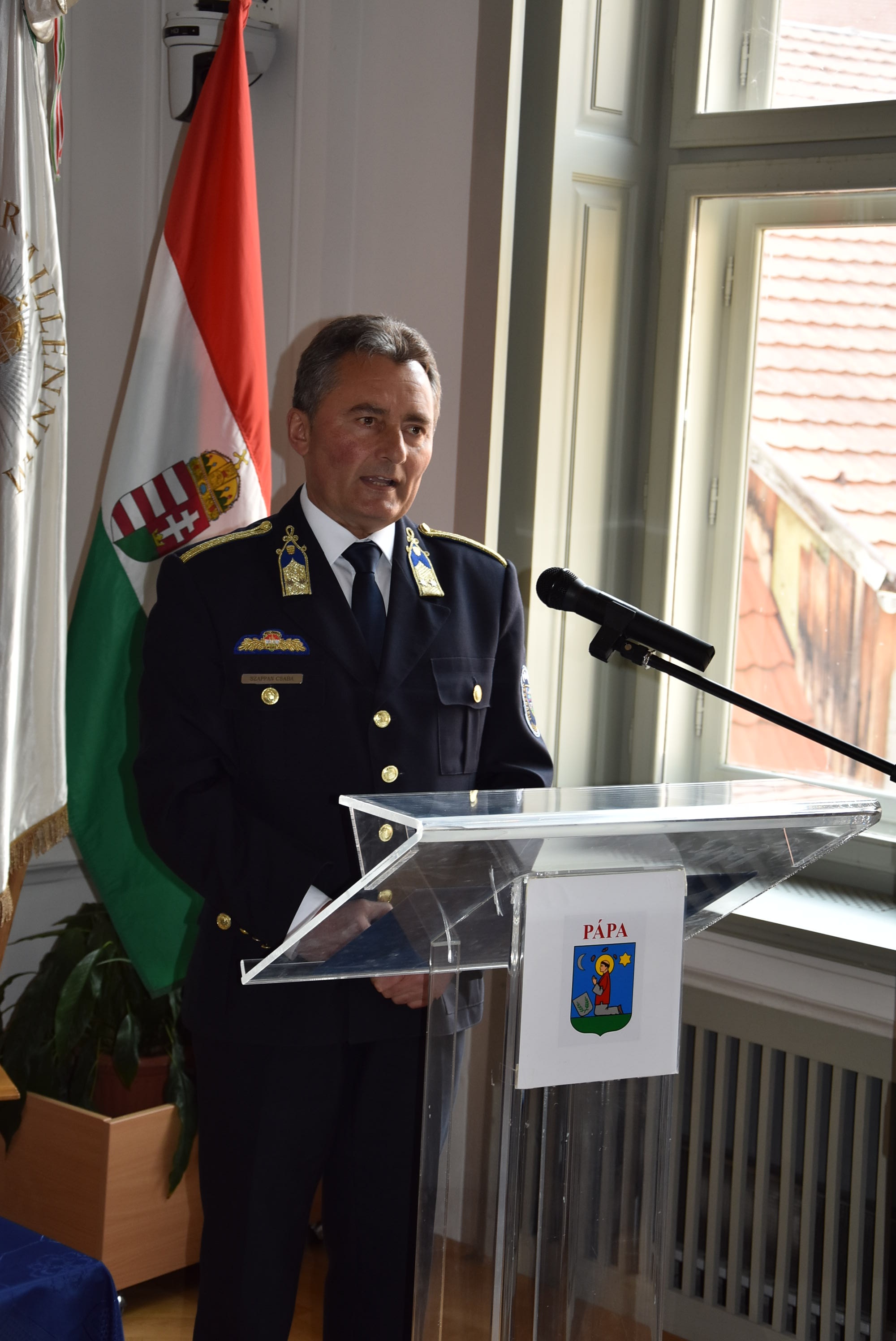 Az évértékelő állománygyűlést megtisztelte hozzászólásával dr. Áldozó Tamás Pápa város polgármestere is, végezetül dr. Tarcsa Csaba r. dandártábornok adott tájékoztatást a Veszprém Megyei Rendőr-főkapitányság 2018. évi tevékenységéről és meghatározta az idei év legfontosabb feladatit.