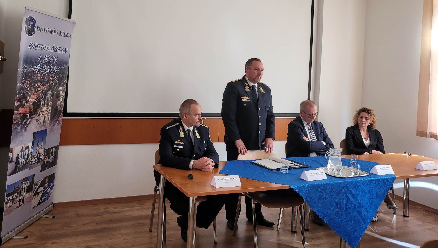 Elsőként Regdon László rendőr ezredes rendőrkapitány értékelte a rendőrkapitányság elmúlt évi munkáját, amelynek alkalmával kiemelte, hogy mind Pápa városa, mind a térség települései biztonságosnak tekinthetők, valamint kihangsúlyozta, hogy munkájukat nagyban segítették a társszervek. Ezt követően Suszter Tamás rendőr ezredes értékelte a Pápai Rendőrkapitányság 2022. évi teljesítményét és meghatározta a következő időszak kiemelt feladatait, többek között a célirányos bűn- és baleset-megelőzési tevékenységet, az ittas vezetők kiszűrésének fokozását, a közlekedésbiztonság javítását, valamint a toborzások folytatását.