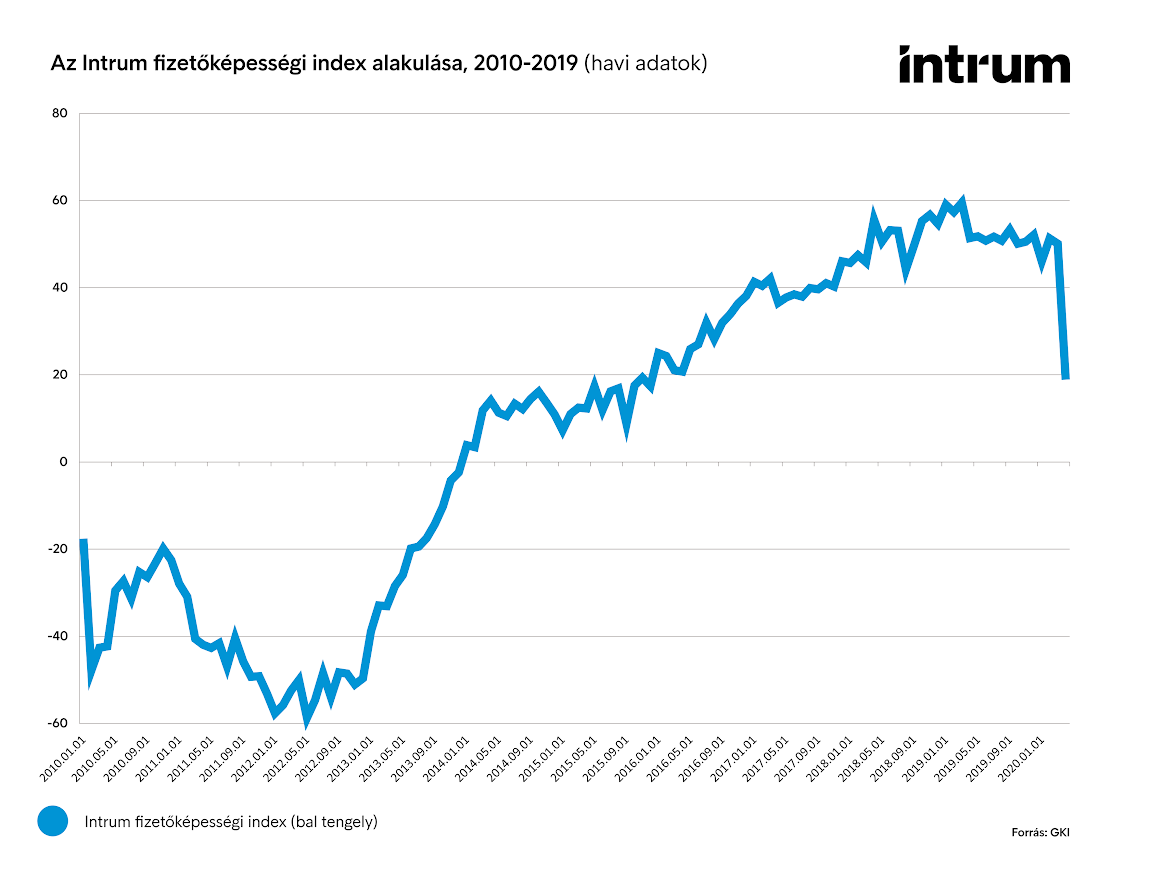 Az idei első negyedév végén az országos lakossági fizetőképességi index (IFI) még mindig igen magasan állt (41,6), ekkor még kevéssé érződött a járvány miatti korlátozások negatív gazdasági hatása. Az Intrum és a GKI szakértői április második felében megismételték a kutatást, és az új adatok már jól mutatták a járvány okozta károkat. Országos szinten a lakosság fizetőképessége több mint 22 ponttal romlott (18,9): egy év alatt eddig ilyen szintű visszaesés példátlan, utoljára 2014-ben állt ilyen alacsonyan a fizetőképességi index.