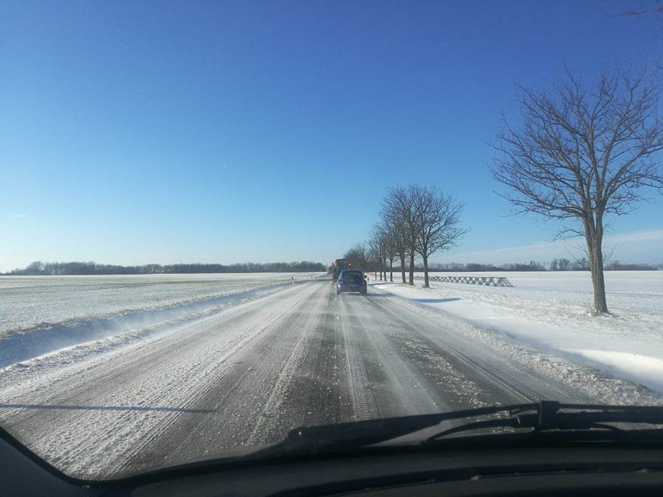 Kerüld a hirtelen kormánymozdulatokat, csak indokolt esetben válts sávot. Próbálj a sávon belül maradni, az útburkolati jelek csúszóssá válhatnak, ha elkapod az út széli fagyos, jeges területet, könnyen megpördülhetsz. Lehetőség szerint kíméletesen állj meg, kerüld a hirtelen fékezést.