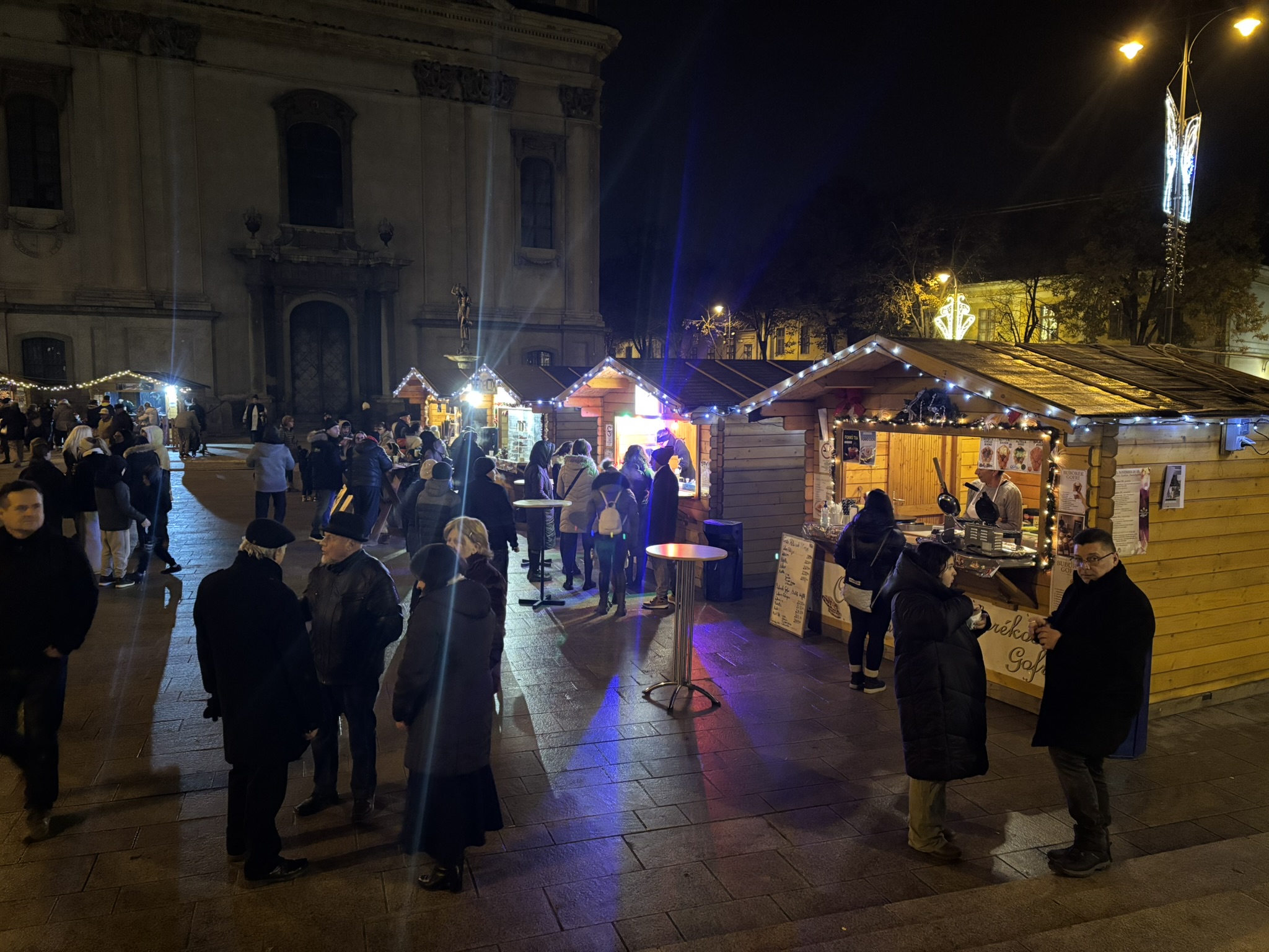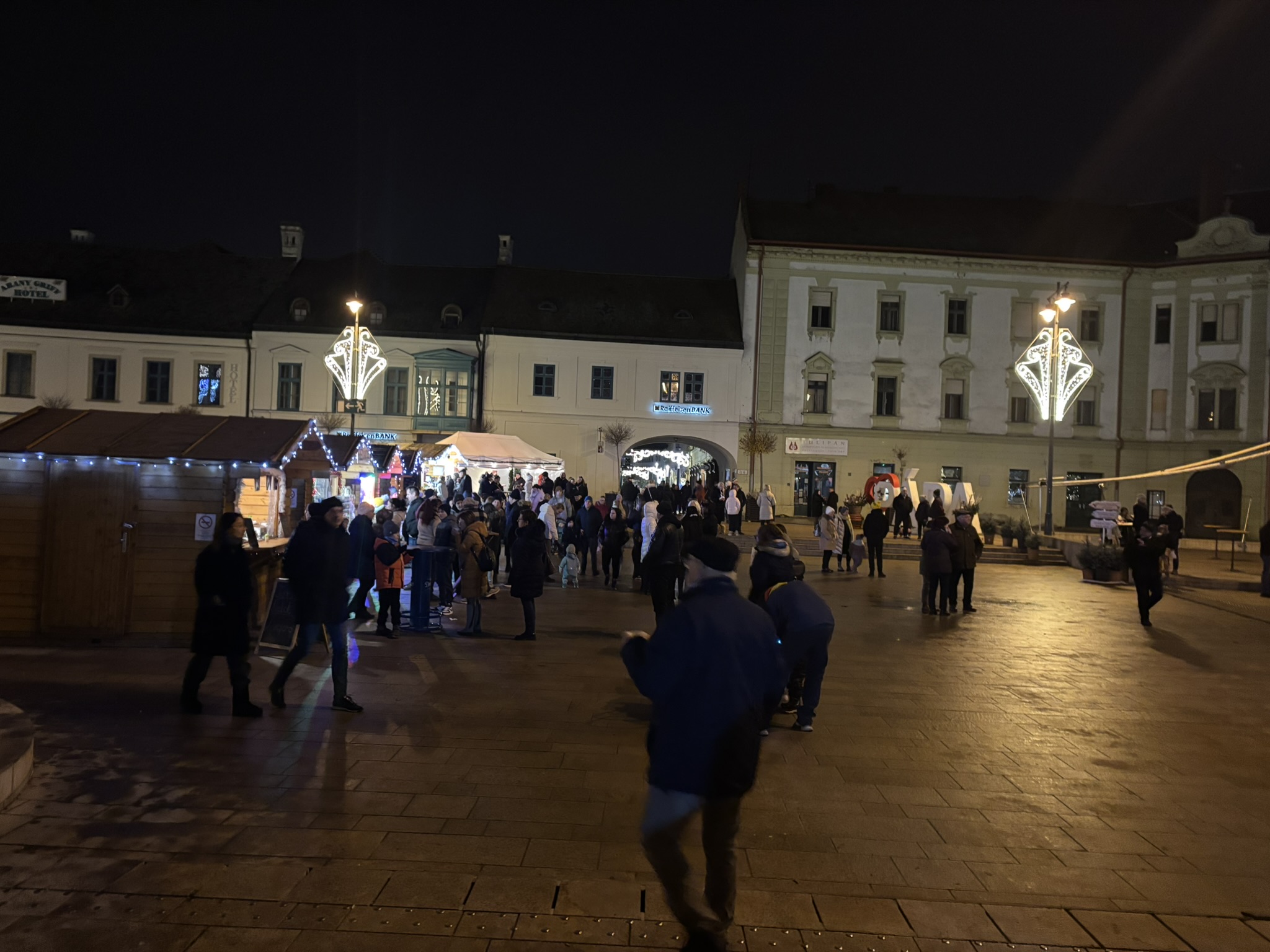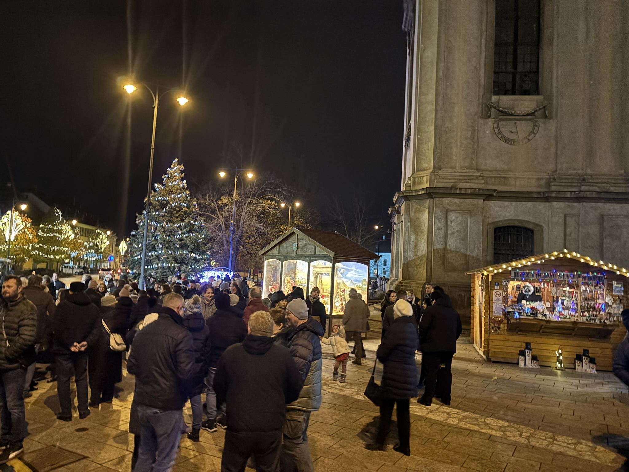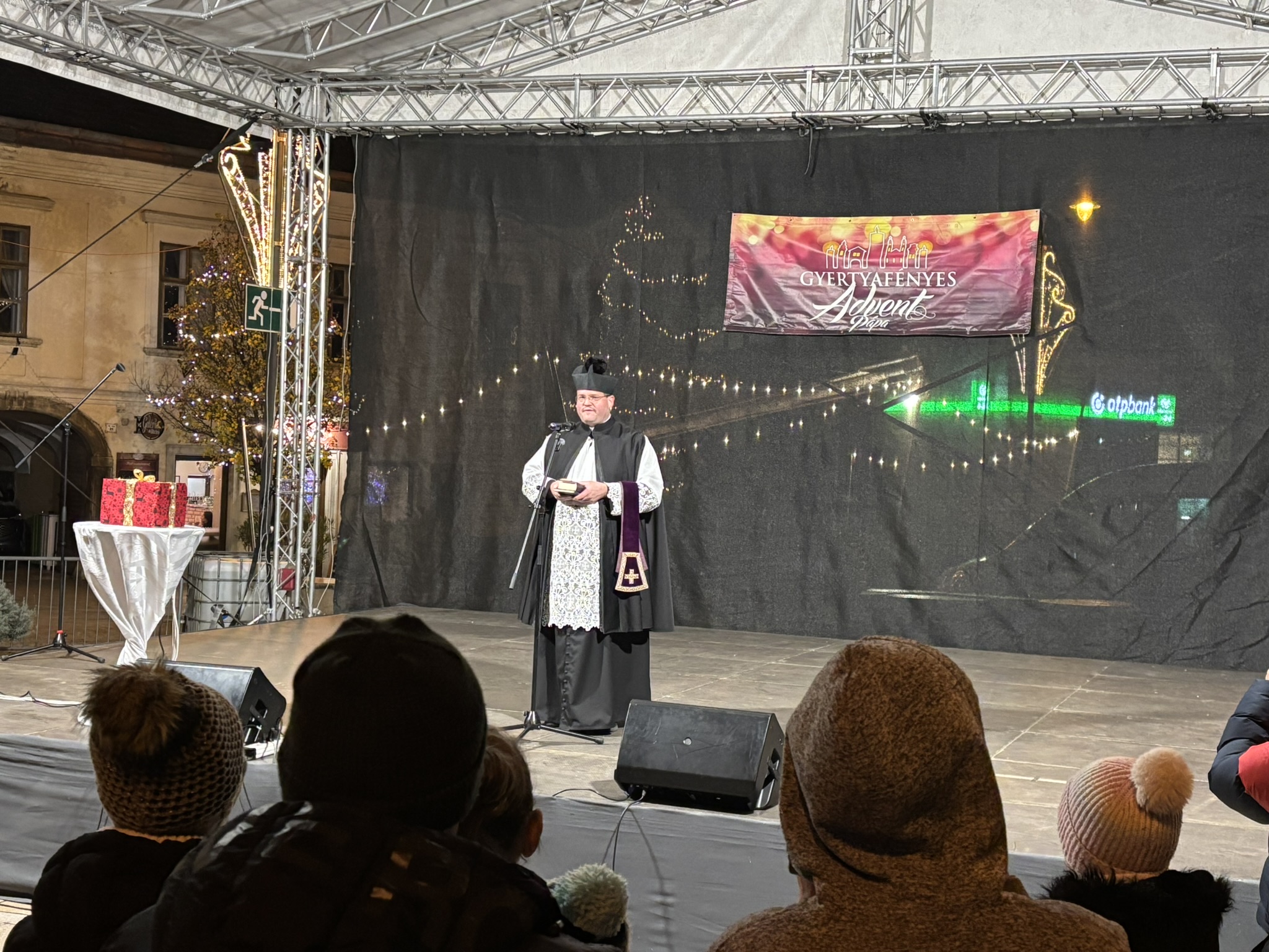 Cséry Gergő plébános kapcsolta fel a város adventi koszorújának első gyertyájának fényét a pápai Fő téren.