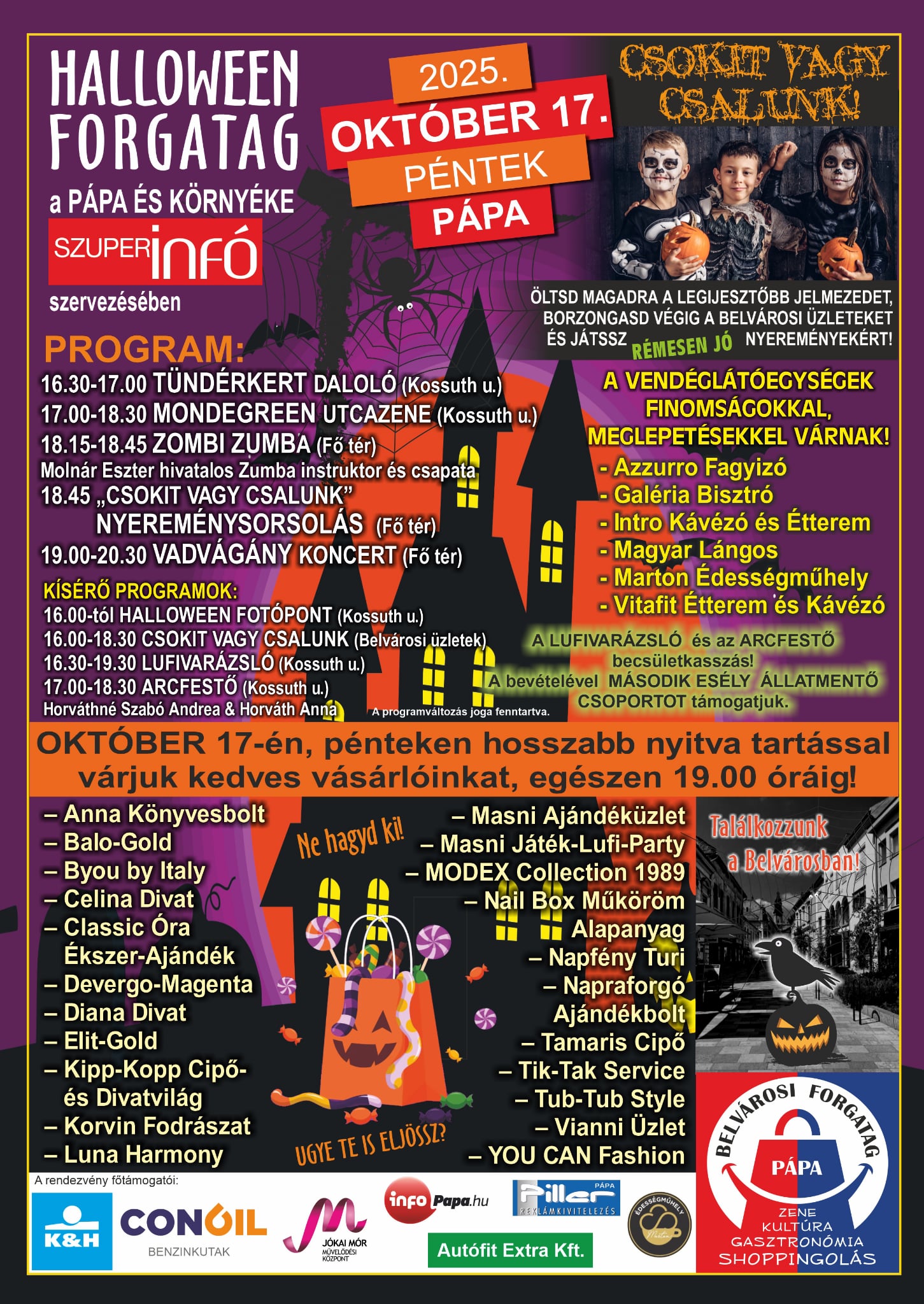 A városban a Pápa és Környéke Szuperinfó szervezésében megrendezésre kerülő Halloween Forgatag is ezt a szellemet képviseli: nem kifejezetten a dátumhoz, hanem az együttlét öröméhez kötődik. Célja, hogy kimozdítsa az embereket a hétköznapokból, közös élményt adjon, és egy kis derűt csempésszen az őszi borongásba. Mert a fényt nemcsak a töklámpások hozzák el – hanem mi magunk, amikor mosolyogva, közösen ünneplünk.