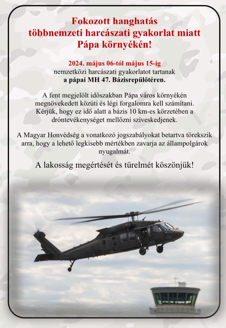 Harcászati gyakorlat miatt fokozott légi és közúti forgalomra kell számítani Pápa térségében