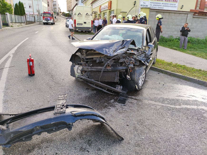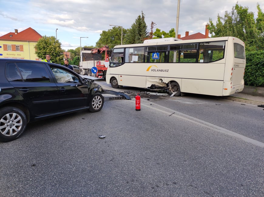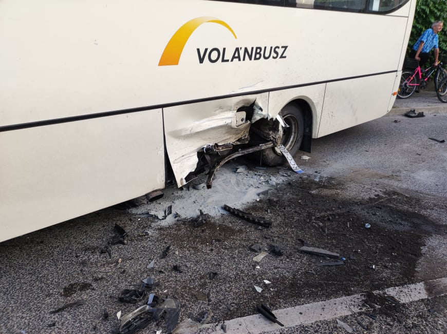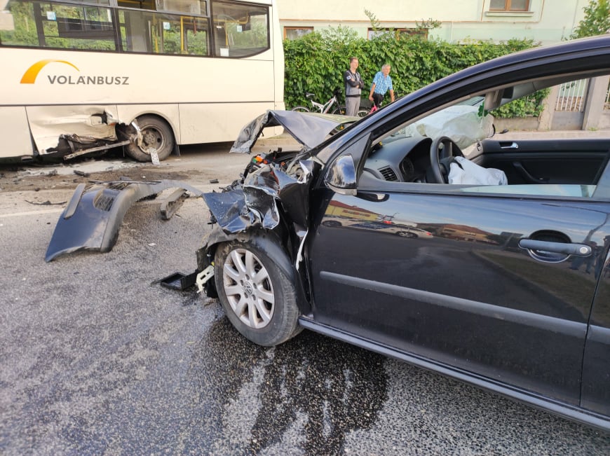 A fekete Volkswagen nagy sebességgel csapódott neki a szabályosan közlekedő autóbusz oldalának. Hárman könnyebben, hárman pedig súlyosan sérültek meg.