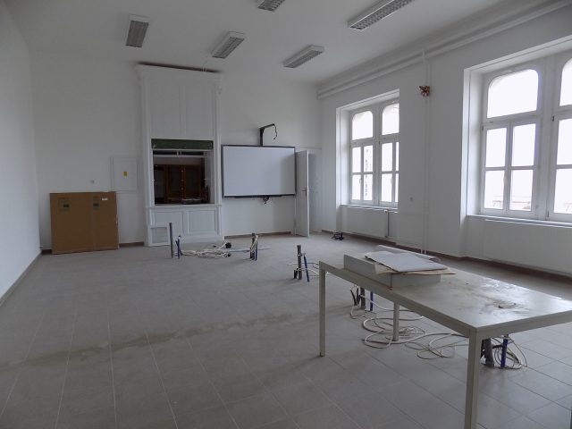 Azokba a Séllyei utcai szárnyban található termekbe, melyekből most kipakoltak a diákok, beköltöztek a szakemberek. Most kint a hideg miatt nem lehet dolgozni, így jól haladnak a beltéri munkákkal, már elkezdték leverni a vakolatot, szerelik a fűtést, a villanyt, hogy mihamarabb ezt a részt is átadhassák a tanulóknak.