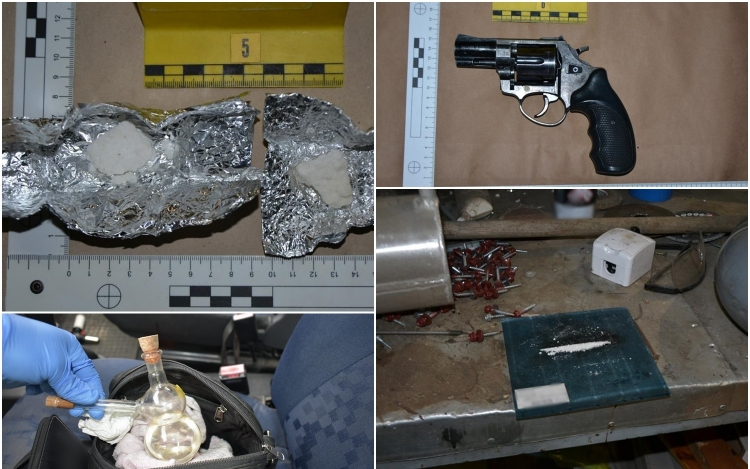 A feltételezett elkövetőkre egy időben, három településen csaptak le Baján, Siklóson és Érsekhalmán. A házkutatásnál 50 gramm kábítószergyanús anyagot, 10 tablettát, fogyasztásukhoz használható eszközöket, két lőfegyvert, riasztófegyvert, lőszereket, valamint készpénzt foglaltak le.