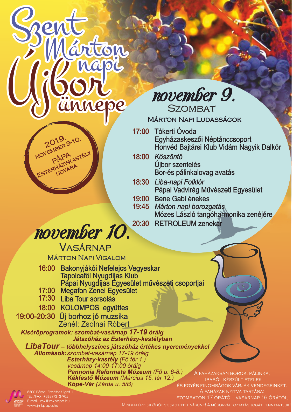 Szombaton este a Retroleum zenekar szórakoztatja a közönséget, a '60-as, '70-es és '80-as évek slágereivel. Vasárnap 18 órától a Kolompos népzenei együttes áll színpadra, amely a Márton-nappal kapcsolatos szokásokat is megeleveníti, interaktív módon. Az új bor megkóstolásához Zsolnay Róber zenél, szinten vasárnap este. Az újbor szentelés ceremóniája és a bor és pálinka lovag avatás sem marad el idén sem, ahogy a Liba Tour sem, amely négy állomáson várja a családokat. A résztvevőket értékes nyereményekkel gazdagodhatnak.