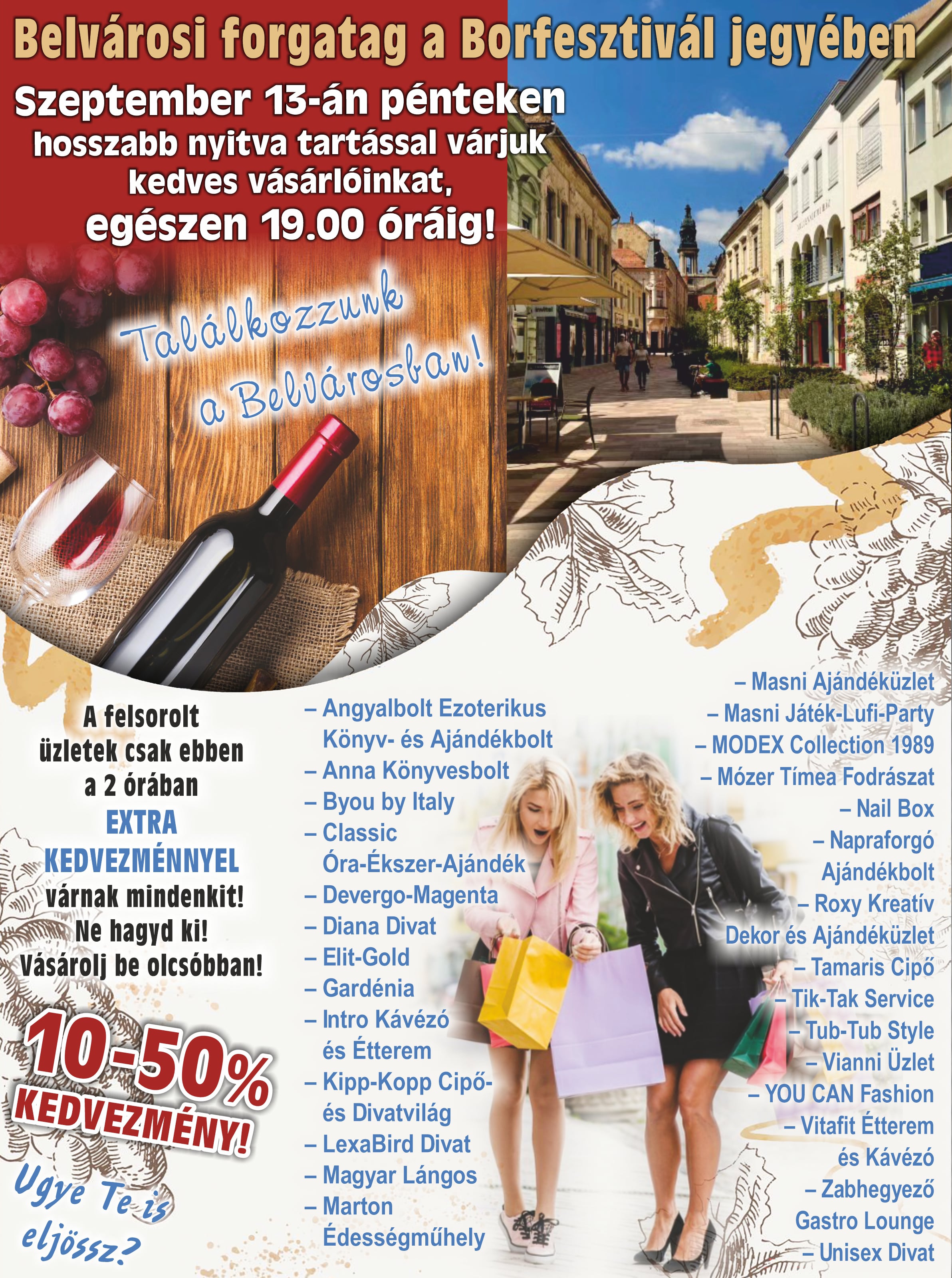 A mai napon meghosszabbított nyitva tartással várják a vásárlókat a belvárosi üzletek, amelyek egészen 19 óráig lesznek nyitva. Az előrejelzések szerint 16 óra után az eső is eláll, tehát a hűvös idő ellenére minden adott lesz a jó hangulathoz!
