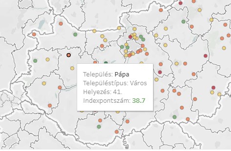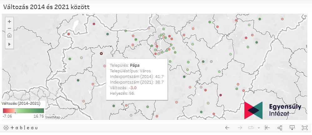 Az Egyensúly Intézet 2014-hez képest figyelte meg a tendenciákat, amelyek Pápa esetében szintén lefelé mutatnak. Míg Ajka és Várpalota gyakorlatilag stagnált ebben az időszakban a kimutatás szerint, addig Pápa 3 pontot veszített 2021-re.