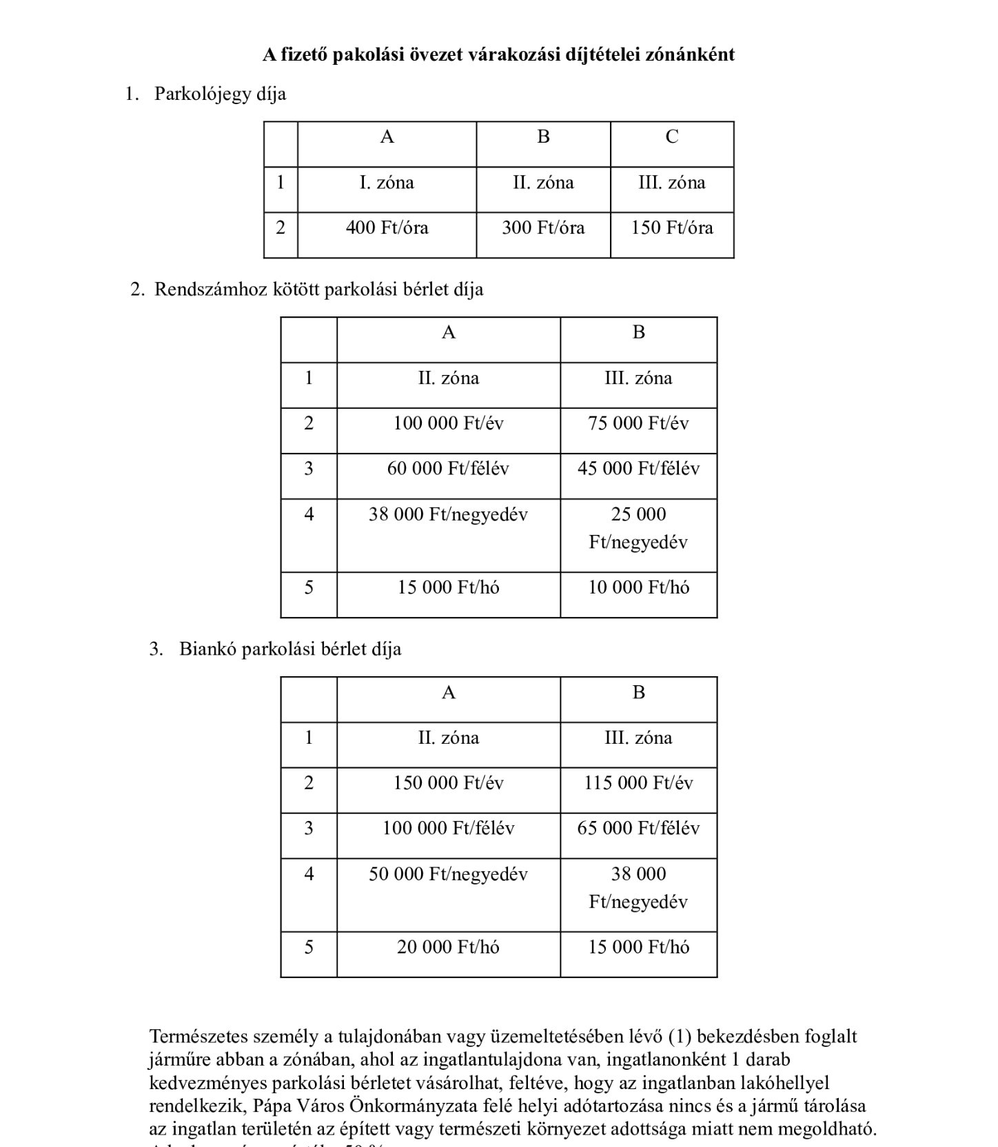 III. zóna: Bástya utca, Szent István útnak a Fő tértöl a Török Bálint utcáig terjedő szakasza, Korona utca, Zimmermann utca, Anna tér, Zrínyi Miklós utca, Gyurátz Ferenc utca, Széchenyi István utca, Flórián utca, Varga utca, Barát utca, Kígyó utca, Irhás utca, Kard utca, Szentilonay József utca, Kis tér, Csatorna utca, Korvin utcának a Bástya utcától a Korona utcáig terjedő szakasza, Világos utca Korona utcáig terjedő szakasza, Fapiac tér, Celli u. 4. szám előtti közterület, Cinca sor, Batthyány utca, Damjanich utca, Séllyei utca, Pápai 6406. hrsz alatti parkoló (Várkerti parkoló) (150 Ft/óra)